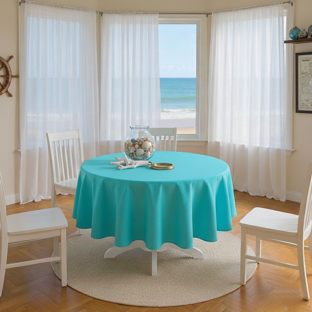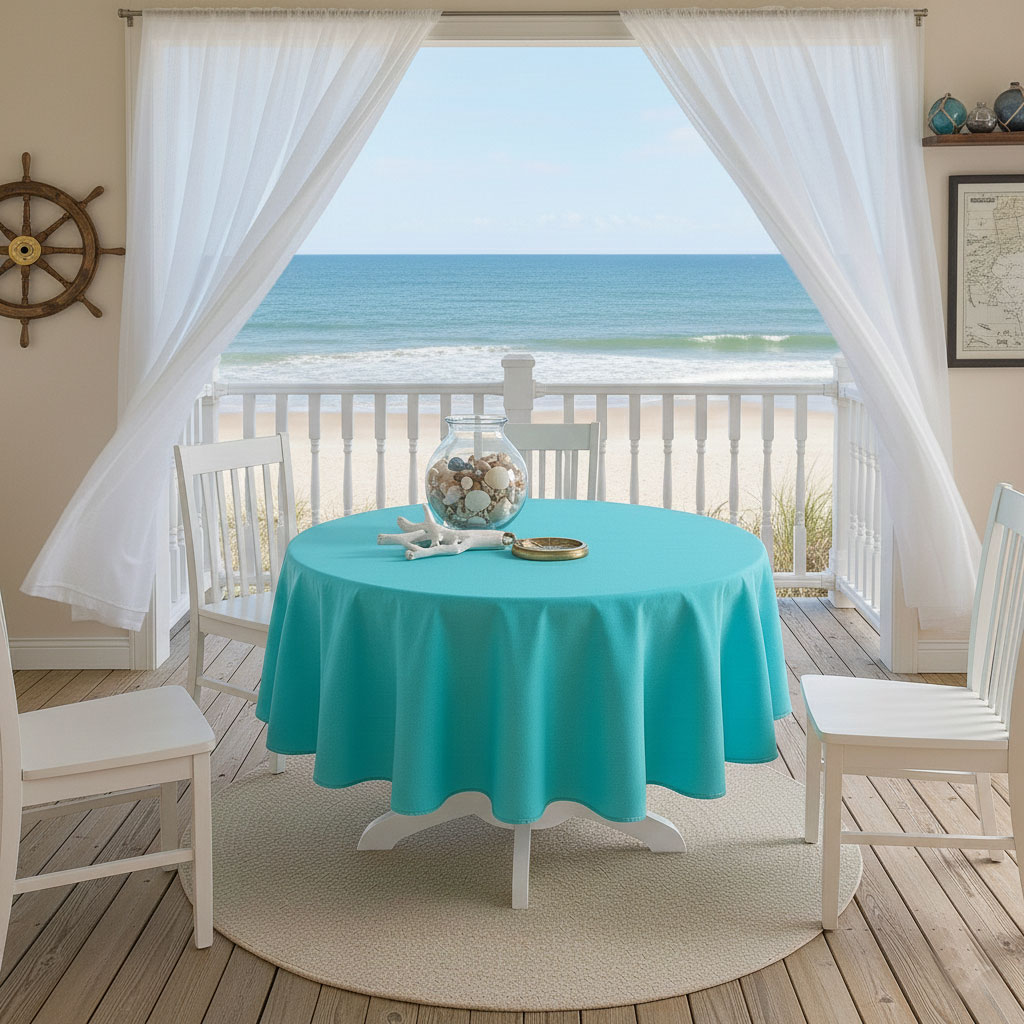синя покривка за маса от водоустойчив плат е класическа. Може да се съчетае с разнообразни прибори за хранене и разноцветни салфетки, с