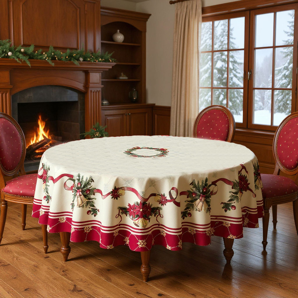 Коледната покривка е ушита от тежък жакардов плат - памук и полиестер. Цветовете са пастелни, класически за Коледа и Нова година.