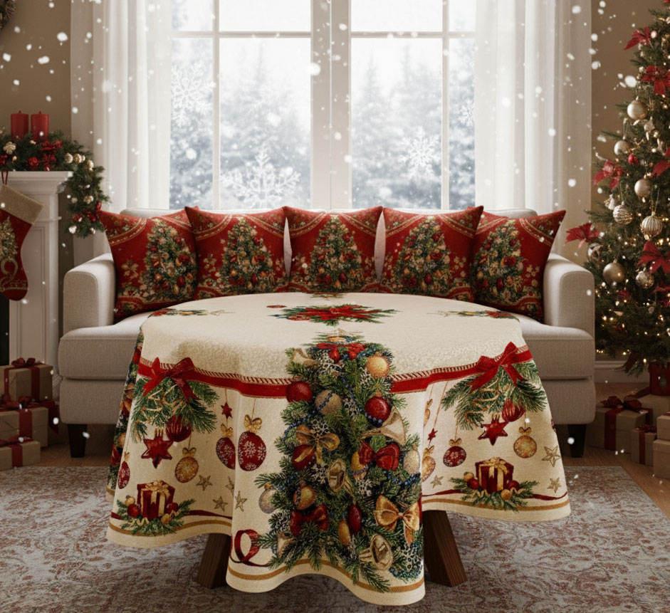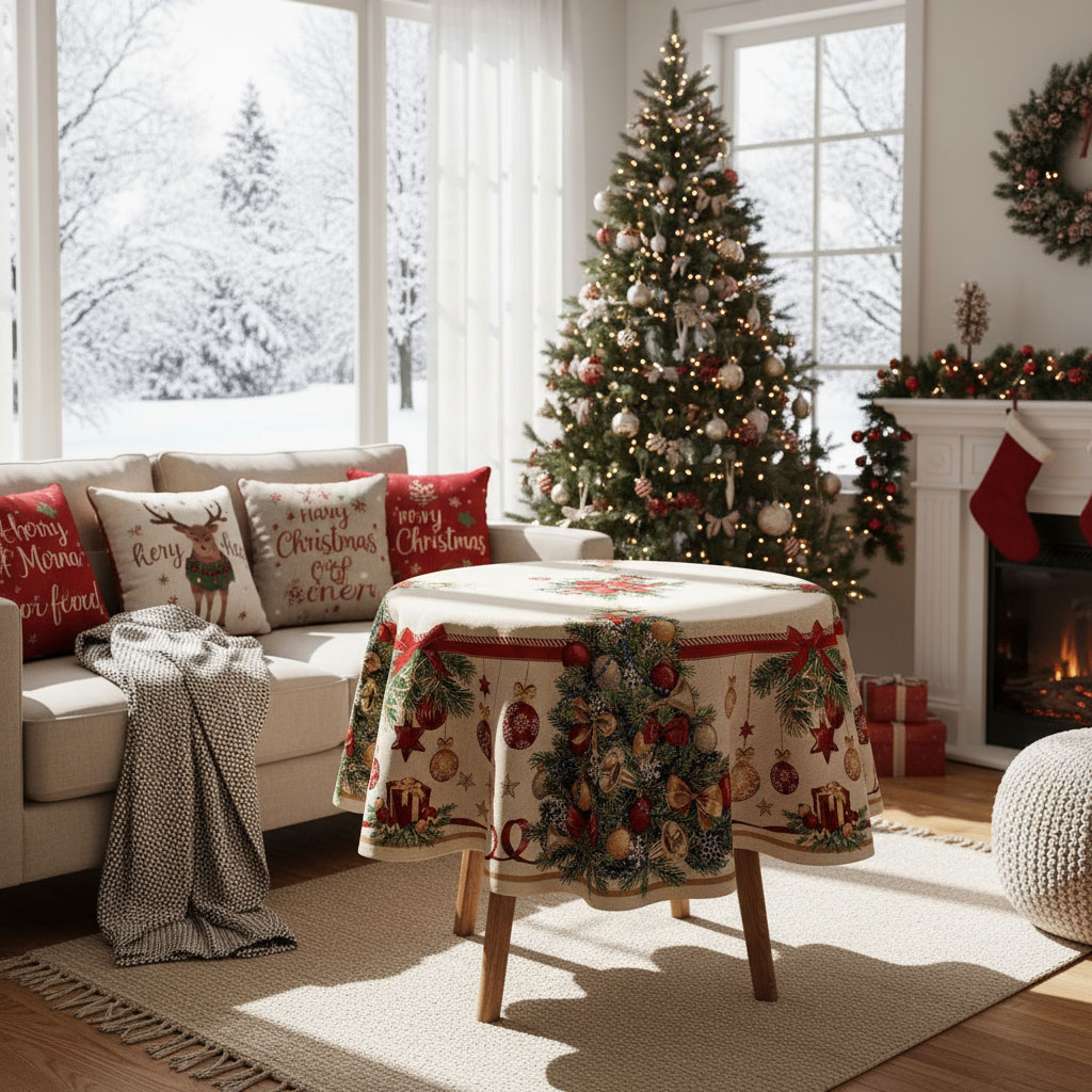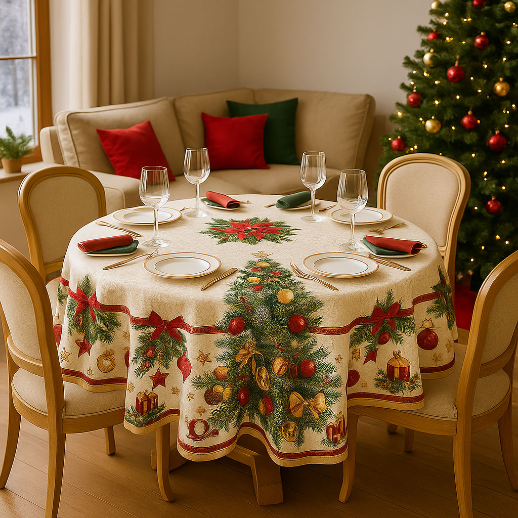 Жакардова коледна покривка за маса е подходяща за стая, обзаведена с мебели от масив и плътни завеси в зелено, бордо или екрю.