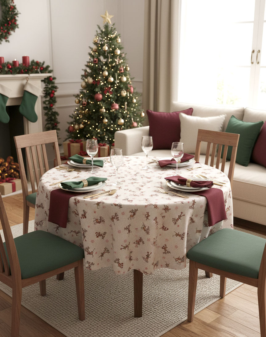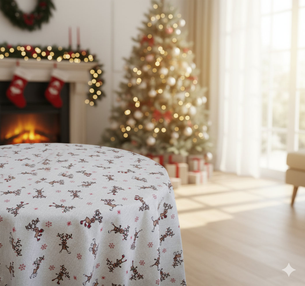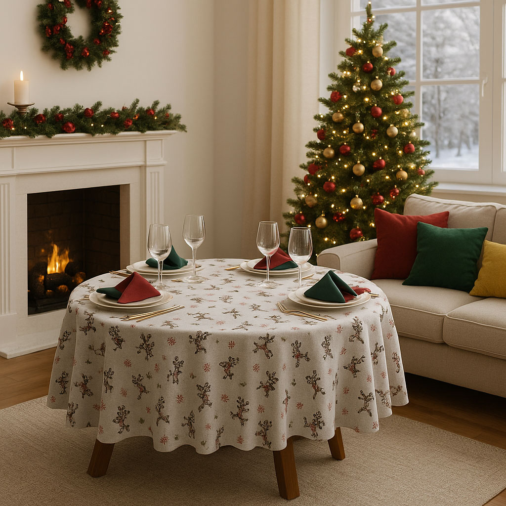 Тази коледна покривка за маса с весели еленчета – приятели на Рудолф – и снежинки ще донесе празнично настроение и усмивки на цялото семейство. Артистично разположените фигурки на Веселия Рудолф и снежинките създават уникална коледна атмосфера, подходяща както за празнични вечери, така и за ежедневни моменти през зимата.