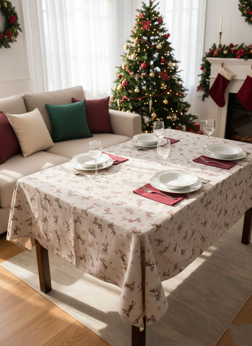 Покривката е идеална за семейни празници и ще внесе топлина и радост във вашия дом. Веселите еленчета и снежинките са подходящи както за официални вечери, така и за декориране на трапезата за празнични събирания с приятели. Тази коледна покривка е не само стилен, но и практичен избор за вашия дом през празничния сезон.