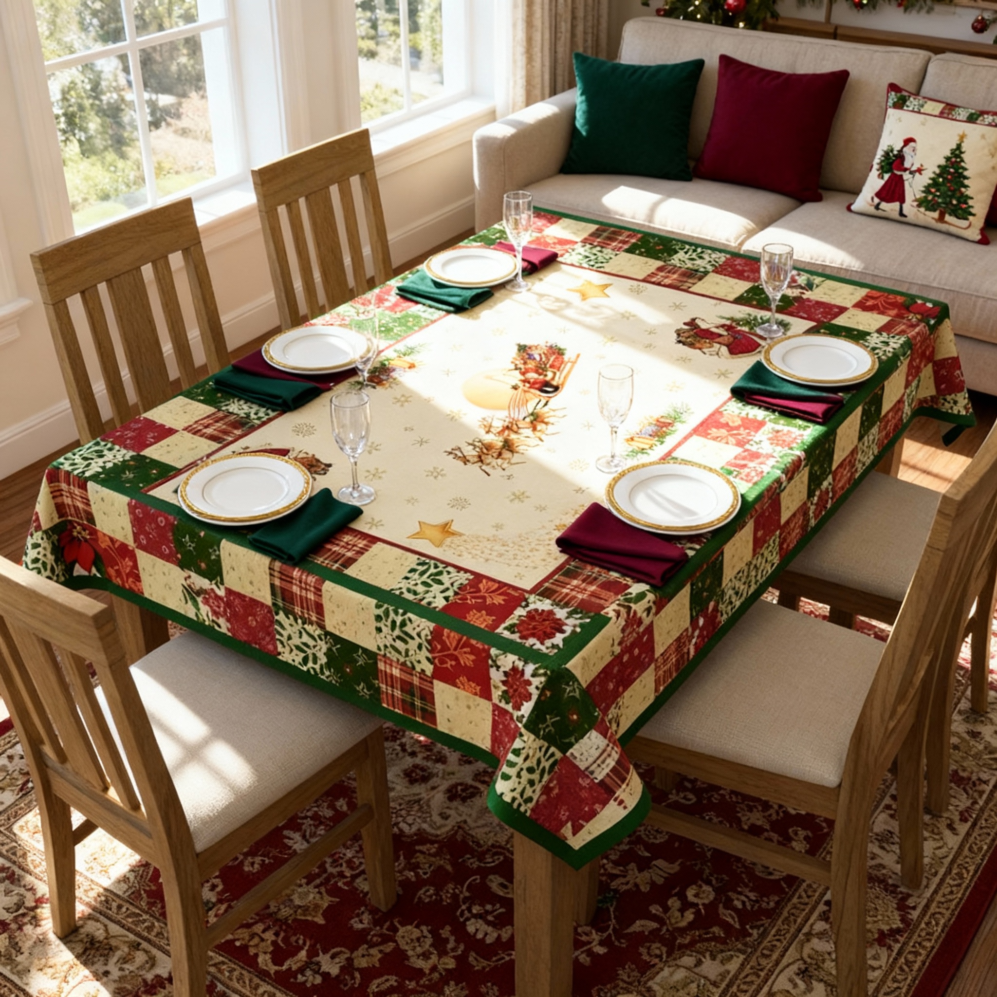 Предлагаме тази Коледна покривка за маса в няколко размера. Изработена е от висококачествен плат памук и полиестер. Жакард.