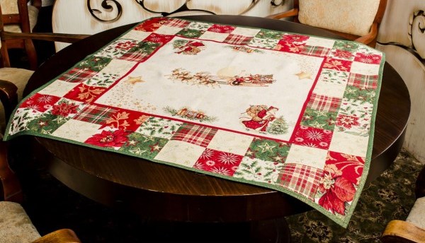 Бордюрът на покривката е от малки квадрати, наподобяващи пачуър от красиви коледни платове.