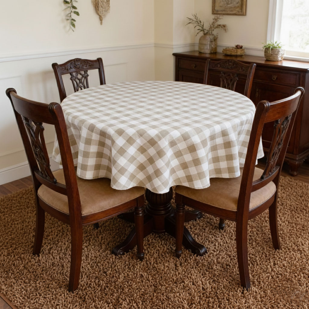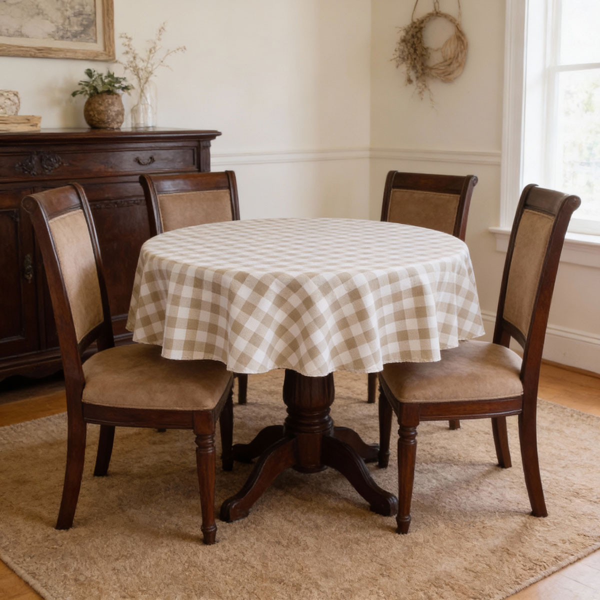 Карирана покривка за маса от водоустойчив плат. Елегантна камбинация от капучино и бяло. Карето е деликтно, сравнително дребно. Съчетайте с бели или кафяви хенгъли. Покривките са особено подходящи за заведение или къща край морето. Стилът е винтидж.