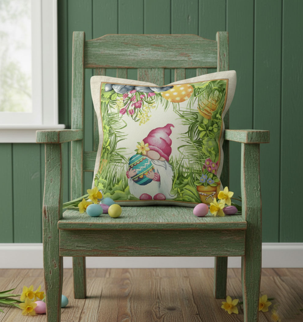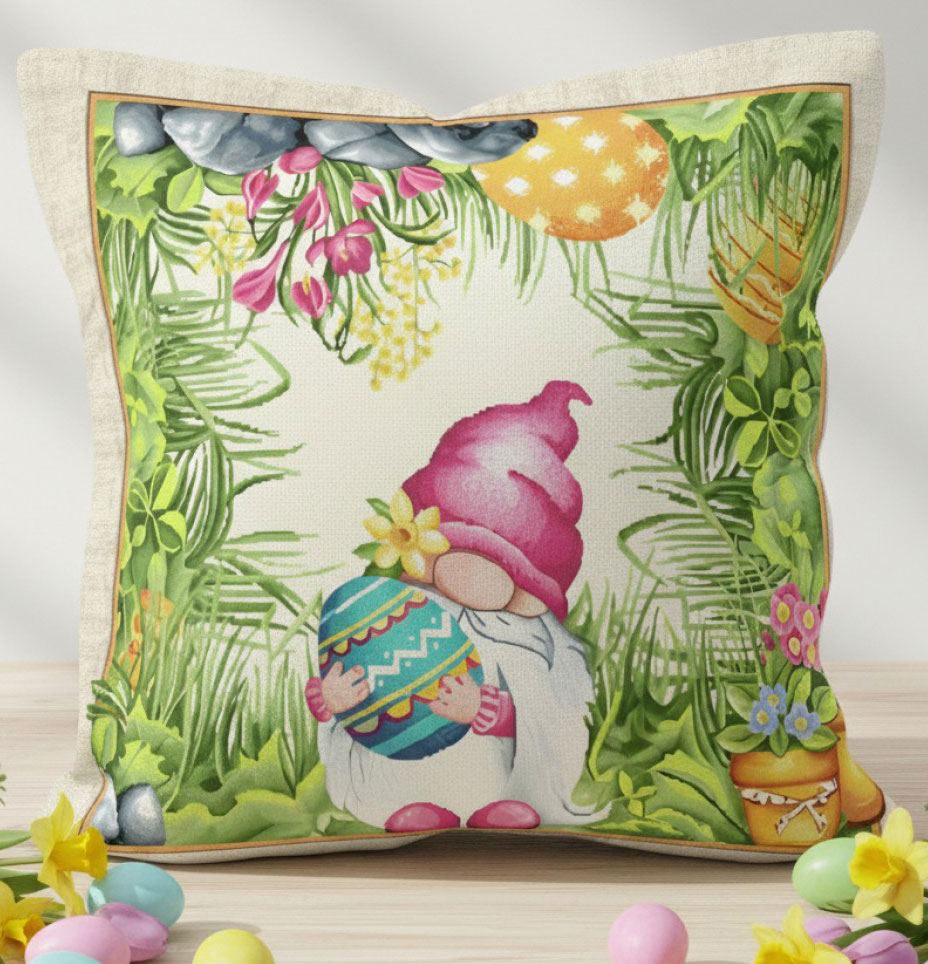 В центъра на калъфката градинско джудже носи голямо великденско яйце, сред пролетна зеленина и цветя. Цветовете са нежни и пастелни – зелено в няколко нюанса, циклама и топло жълто. Те създават усещане за радост и хармония, идеално за Великден.