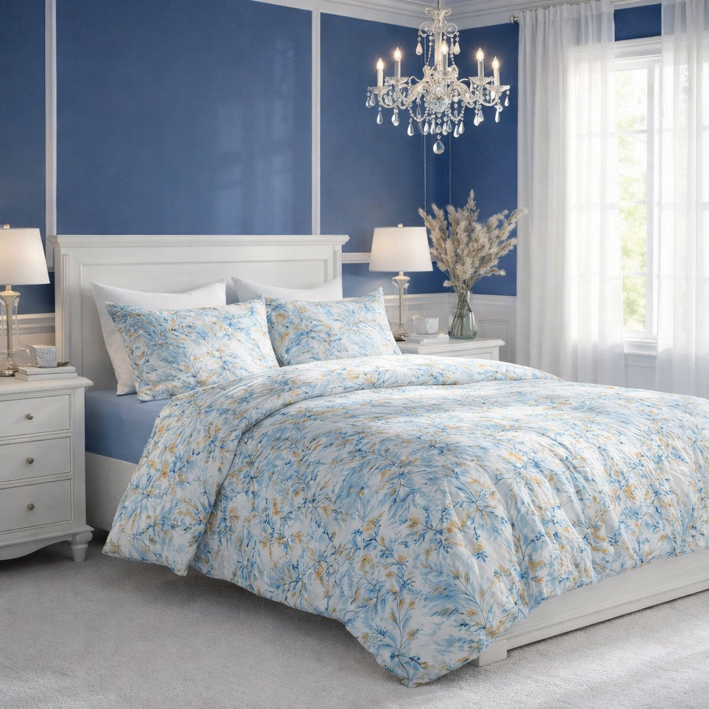 Памучен спален комплект от великолепен плат - ранфорс. Артистична гора с лазурен акцент върху светъл фон. Комбинацията е внушаващо нежна, материята е привлекателна, актуална за всички годишни сезони.