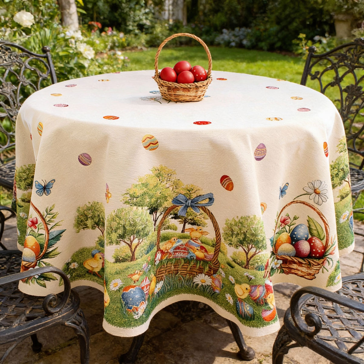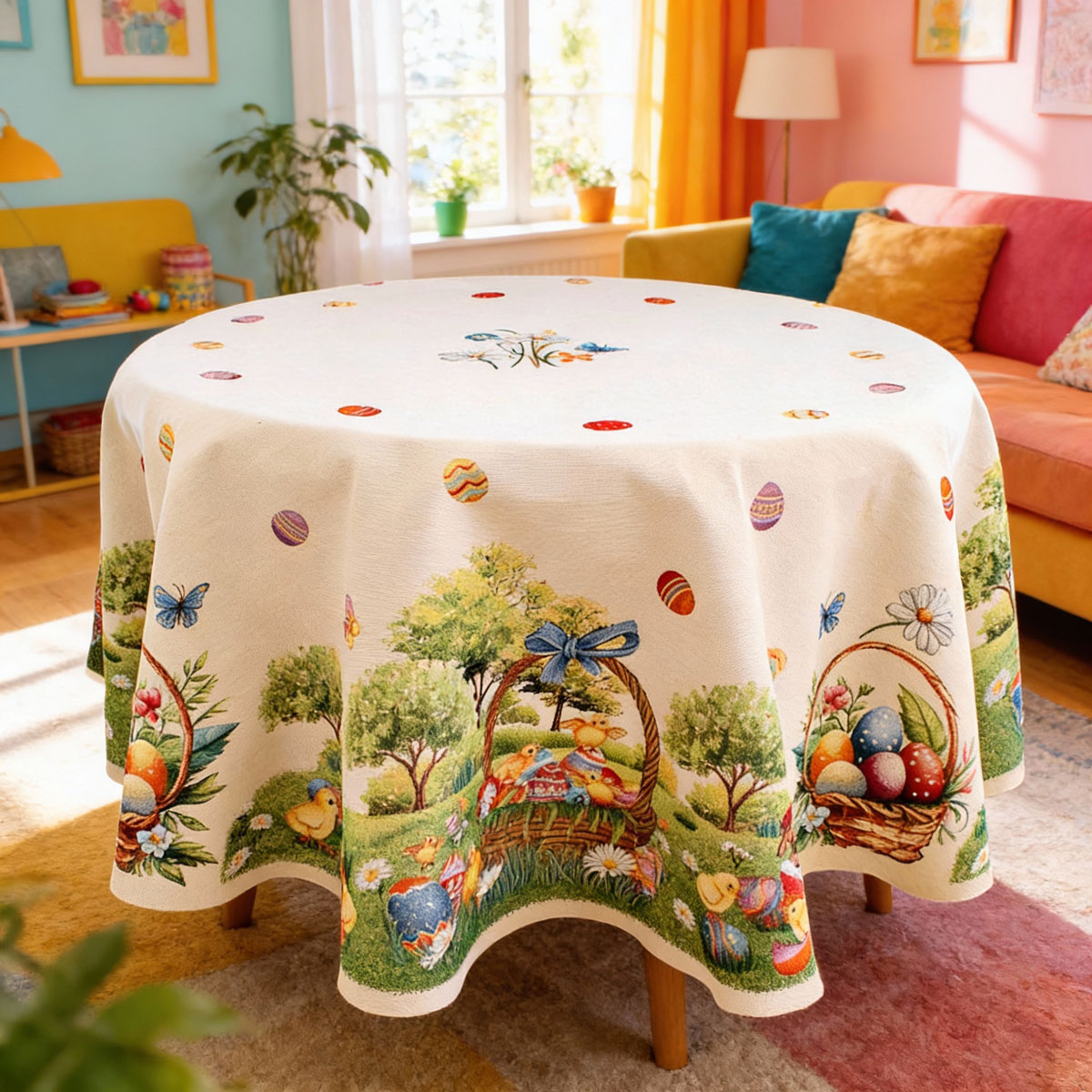 Тази великденска покривка за голяма кръгла маса е подходяща за подарък.