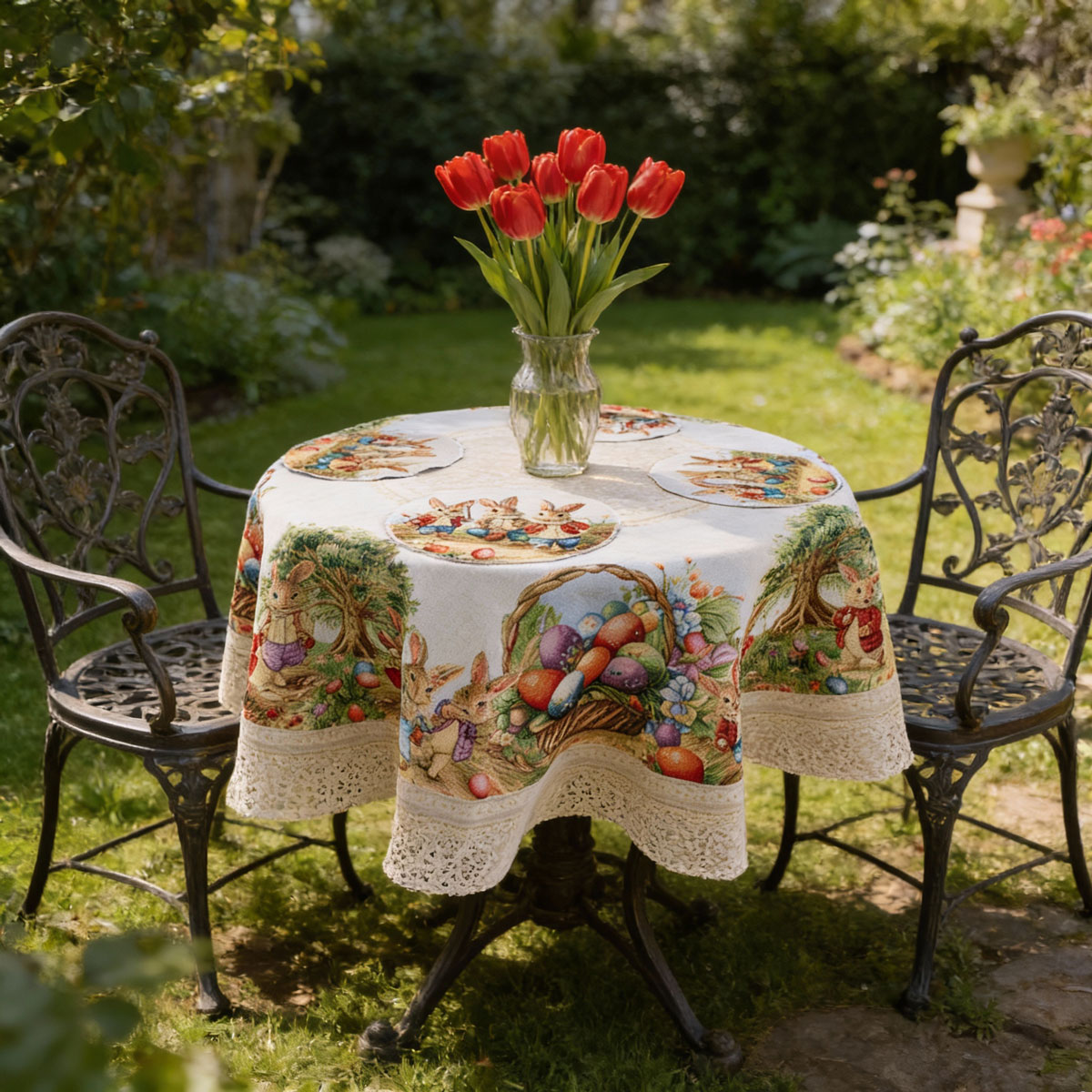 Великденска покривка за кръгла маса и малки кръгли салфетки. Пролетна гора, пътечка и цветя - малки зайчета и кошница с яйца. Напомня приказната картина.