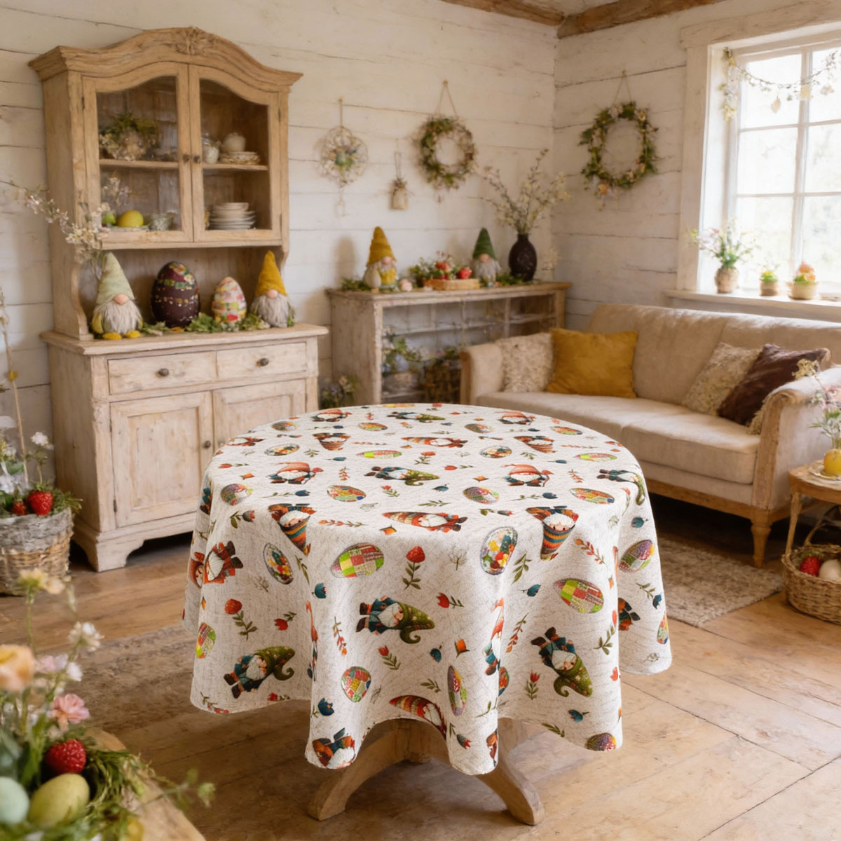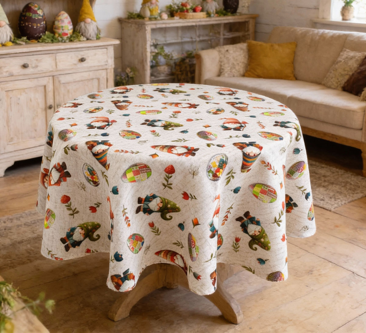 Тази чудна покривка за Великден с приказни мотиви се предлага в различни варианти. Съчетайте я с карета и тишлайфери от същия плат.