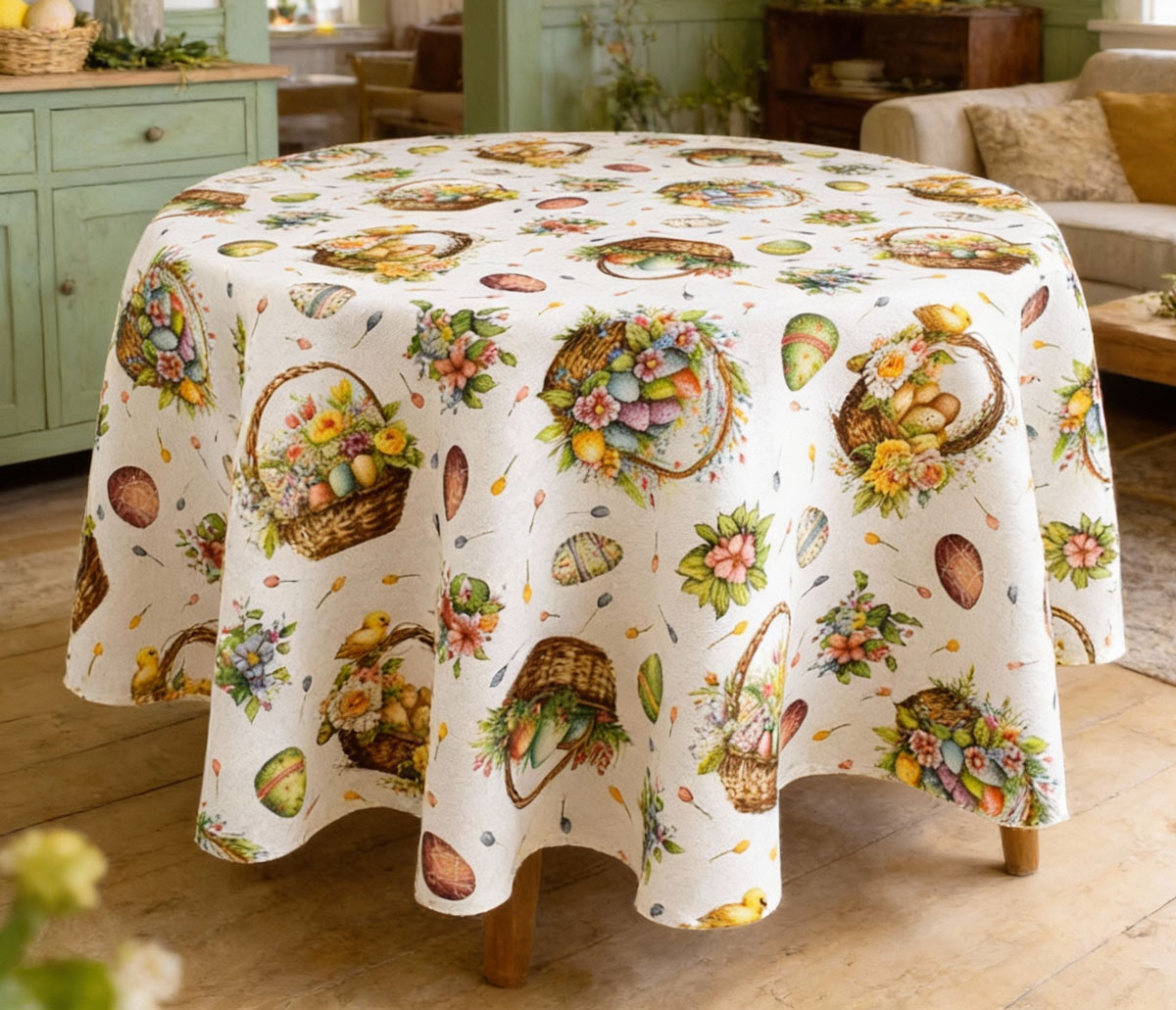 Съчетайте великденската покривка с едноцветни салфетки и хенгъли - жълти, оранжеви, сини и зелени. Прекрасно съчетание бихте получили с едноцветно каре или тишлайфер. Поставете кошница с боядисани яйца. Наберете свеж пролетен букет и допълнете с върбови клонки.