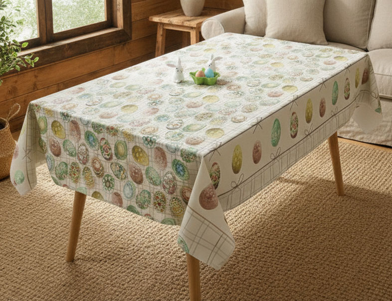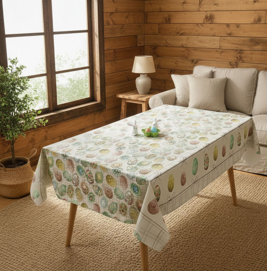 Покривката има бордюр с пъстри яйца и фини панделки. Фонът е светъл с каре, което подчертава свежестта на картинките.