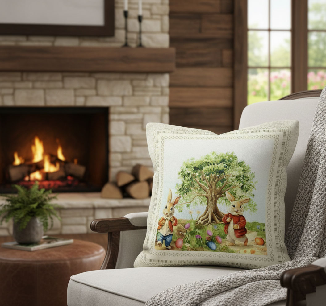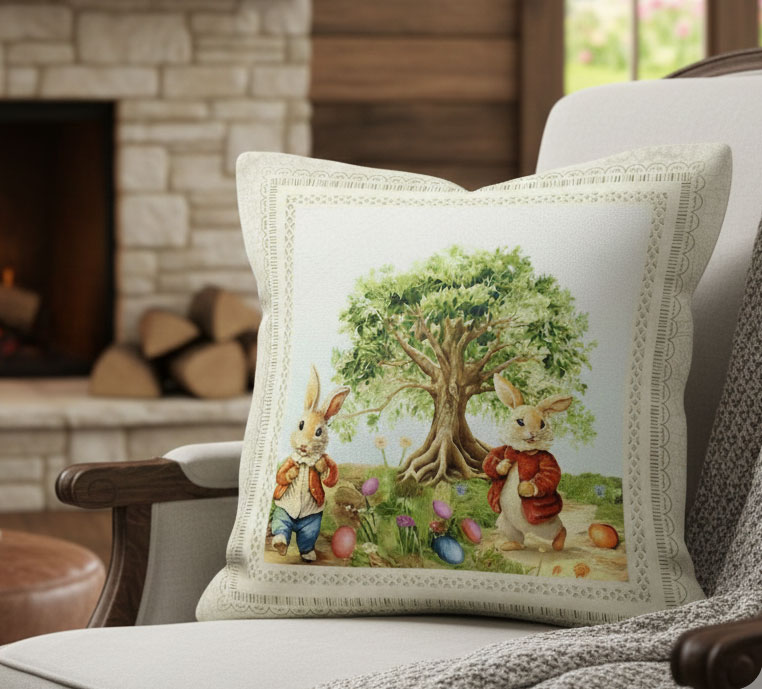 Жакардова калъфка за Великден - на светъл фон подскачат две зайчета, в далечината е вековно разлистено дърво. Пролетта е навсякъде. Традиционни великденски цветове. Създайте тържествена атмосфера за светлия празник - Великден.