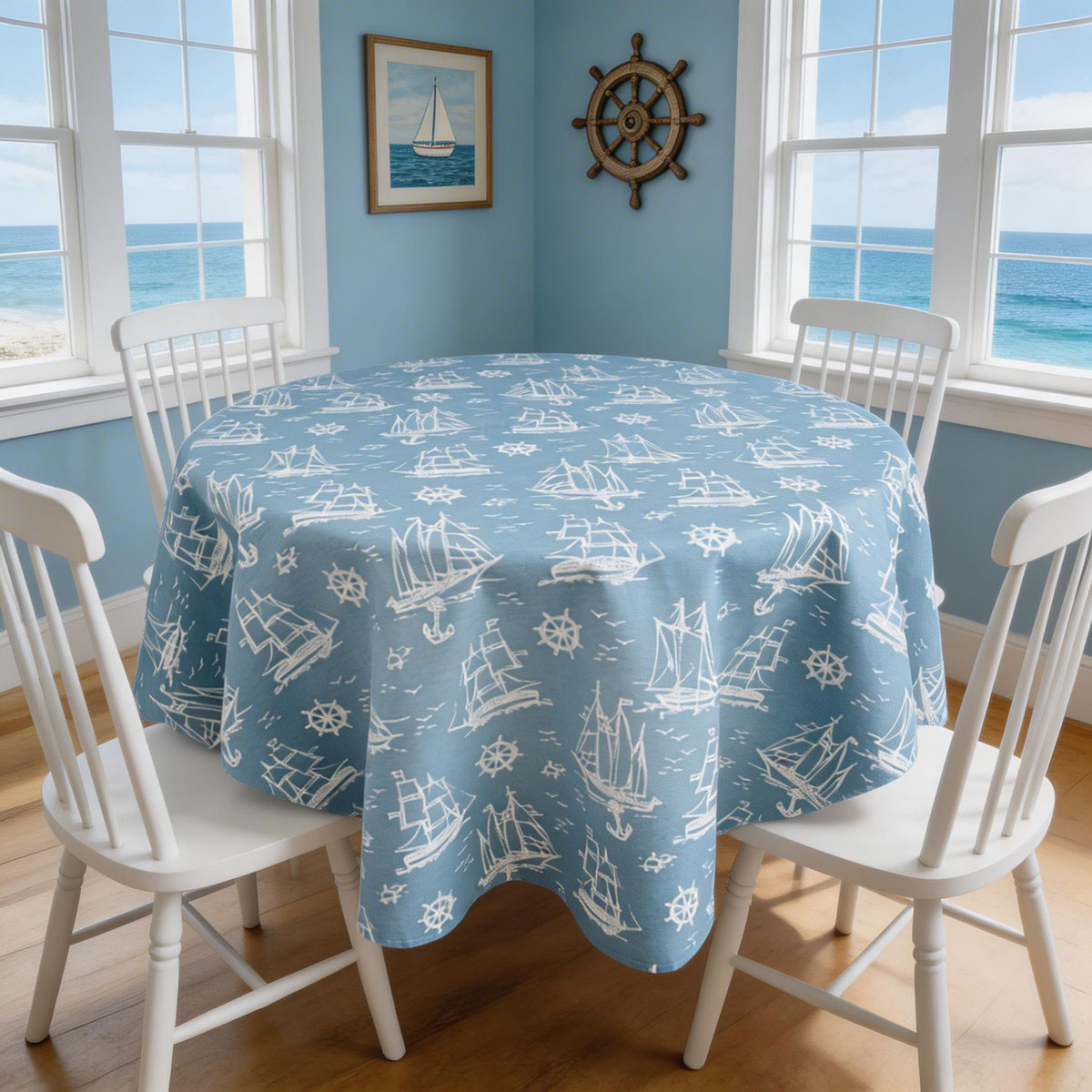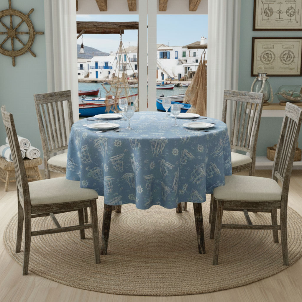 Светлосиня покривка за маса с морски мотиви - рул, кораб с платна, чайки, ушита от водоустойчив плат. Материята е комбинация от памук и полиестер. Предлага се в стандартни размери и може да се ушие по размери на клиента. Максимална ширина на плата е 180 см.