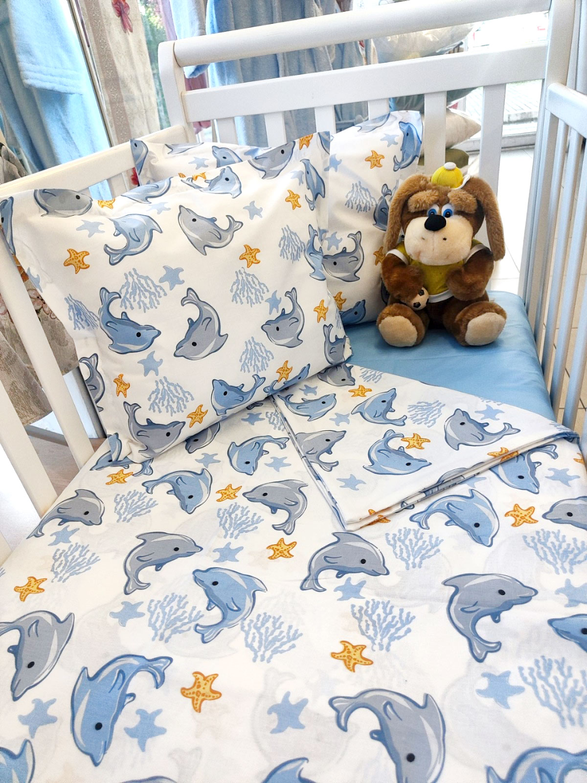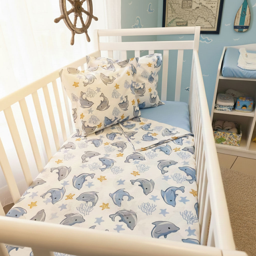 Бебешки спален комплект от ранфорс с делфини и морски звезди – за нежна грижа и морски сънища.