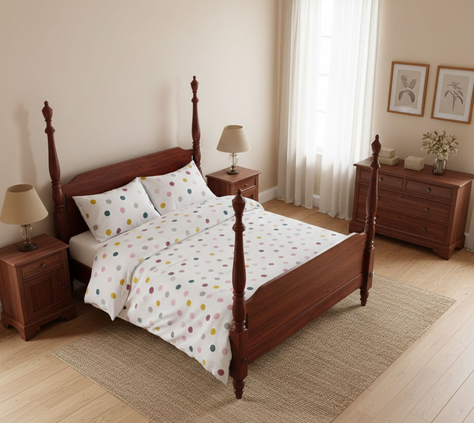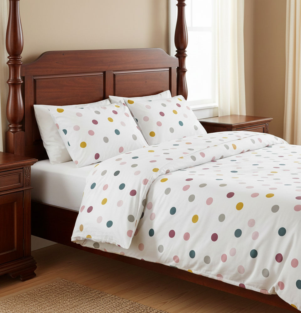 Спалният комплект с цветни точки е създаден да внесе настроение в различни помещения. Подхожда идеално на светли, скандинавски или пастелни интериори, където чистият бял фон се комбинира прекрасно с дървени акценти, кремави щори или меки завеси.