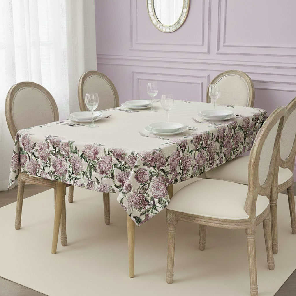 Създай стилна и хармонична атмосфера у дома с тази разкошна жакардова покривка с широк цветен бордюр от лилави божури и зелени клонки. Централната част е решена в елегантен екрю нюанс със симетричен бароков мотив, който придава дълбочина и изтънченост на цялата композиция.