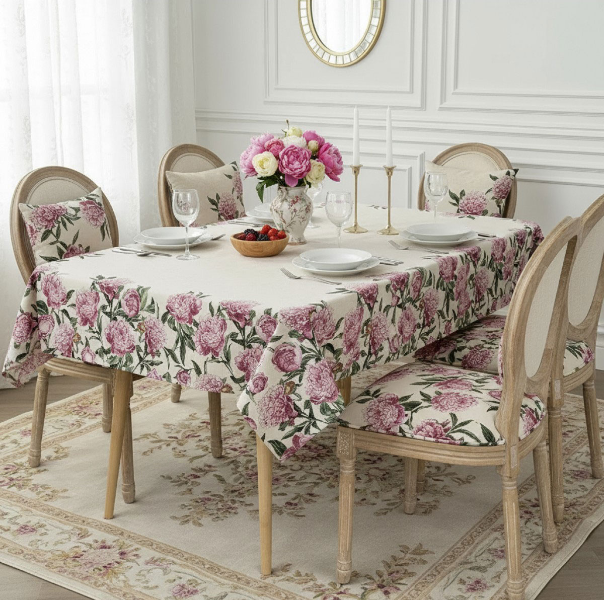 Божурът е символ на изобилие, уважение и романтика – придава на покривката не само естетическа стойност - и емоционално излъчване. Тя е подходяща както за ежедневно ползване, така и за празнични моменти, когато искаш трапезата ти да изглежда наистина специално.