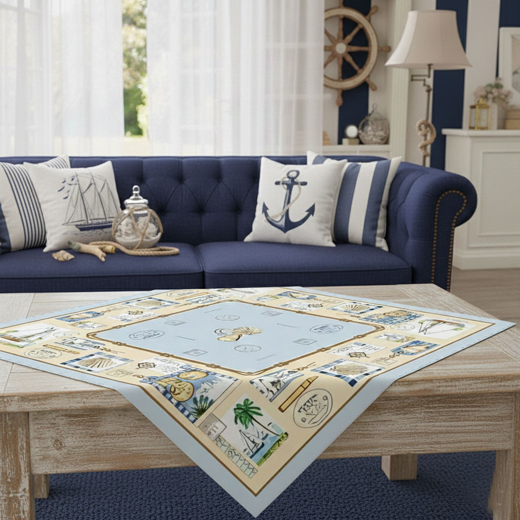 Потопи се в крайморското настроение с това стилно жакардово каре, което носи лятна атмосфера независимо от сезона. Центърът му е в нежно синьо с рисунки на миди и навигационни мотиви, обграден от рамка, напомняща корабни въжета. Оживяват живописни изображения – корабчета, картички, миди, палми, морски звезди, карти за пътешественици и надписи, които създават усещане за спомен от пътуване.