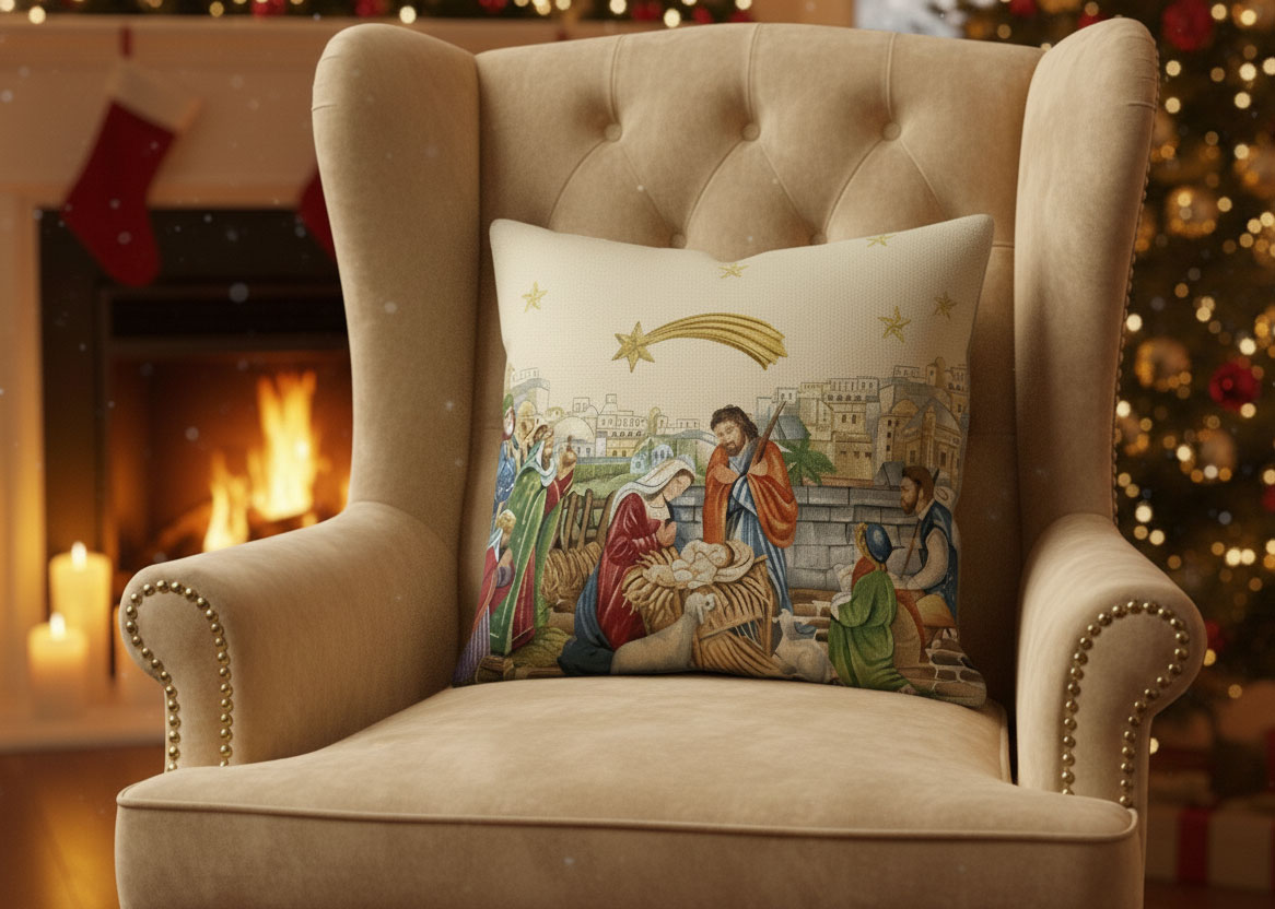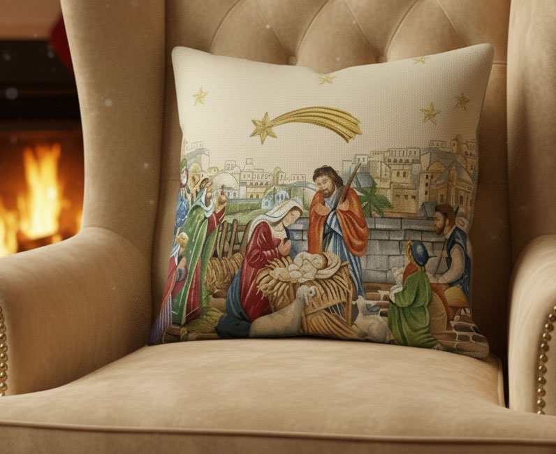 Внеси светлина и духовност в празничната си украса с тази изключителна жакардова коледна калъфка с мотив Рождество върху кремав фон. Изпълнена с мекота и символика, тя представя сцената на Христовото рождение в детайлна и топла илюстрация – с Младенеца, Дева Мария, Йосиф и мъдреците под звездното небе. Светлият кремав фон придава мекота и баланс на цветовете, правейки калъфката стилна и ненатрапчива част от интериора.