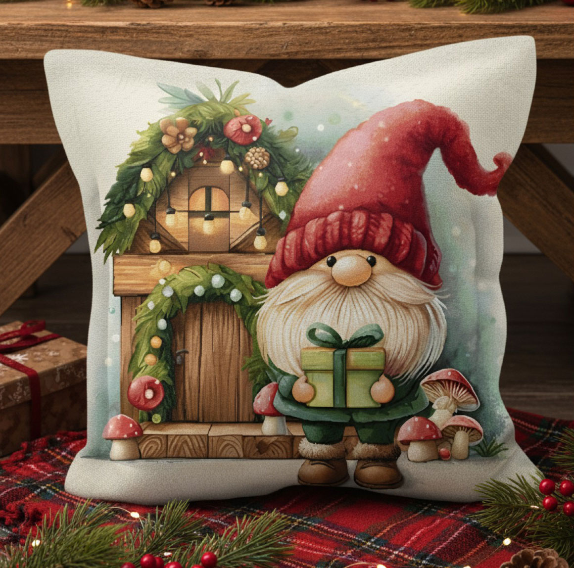 Създай своя малък коледен свят с тази приказна коледна калъфка от жакард, която сякаш оживява в момента, в който я поставиш върху дивана, леглото или любимия фотьойл. В центъра на дизайна – симпатично джудже с червена шапка и подарък в ръце, застанало пред своята малка къщичка, украсена с гирлянди, венец и гъбки – като сцена от зимна приказка, която разказва за доброта, очакване и уют.