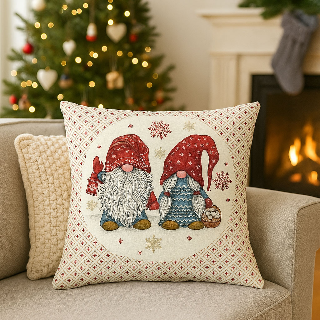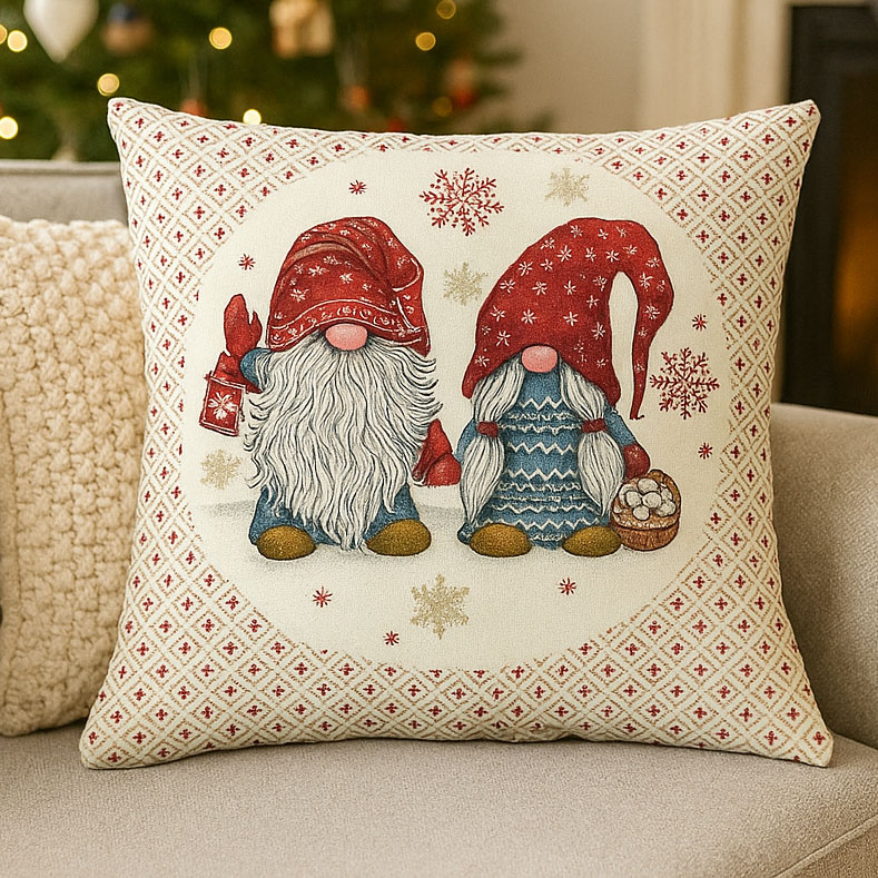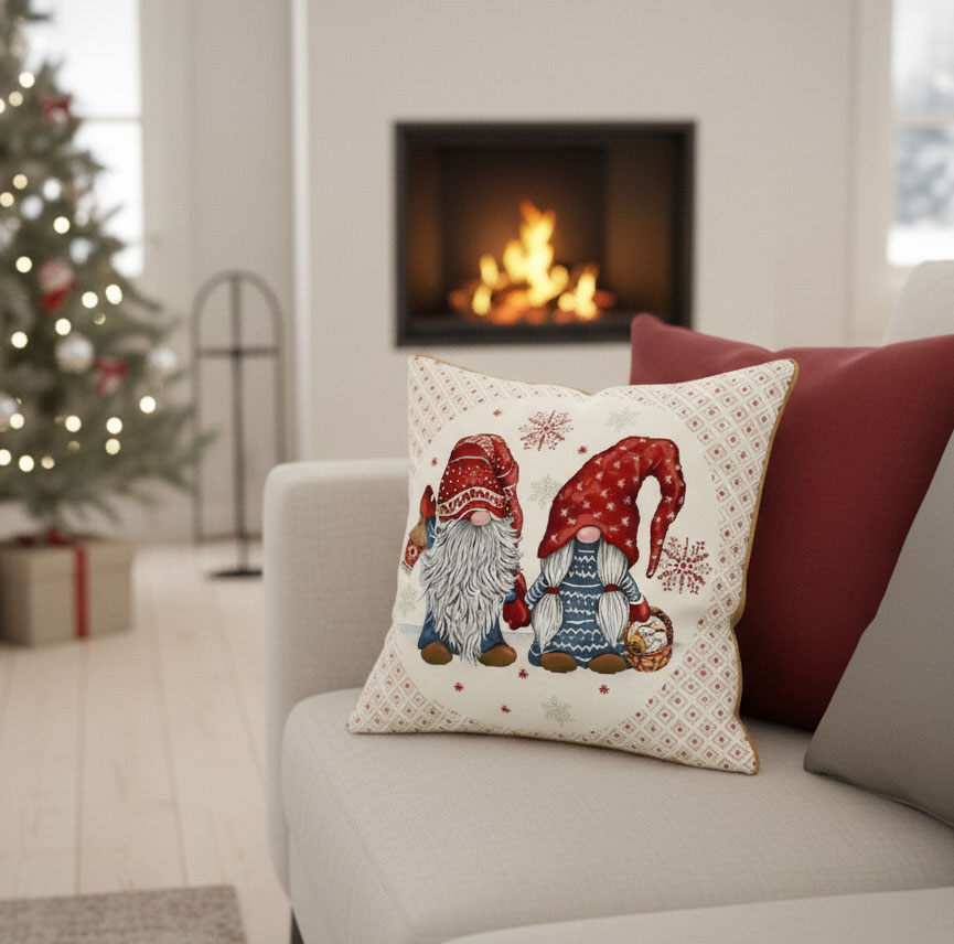 Тази коледна калъфка от жакард е перфектен избор за креслото в дневната, детска стая или дори в офиса, ако искаш да внесеш закачливо празнично докосване. Комбинирай я с други възглавници в бяло, сиво, червено или синьо, за да подчертаеш джуджетата и снежинките. Подходяща е и за скандинавски декори с дърво, плетива и меки одеяла.