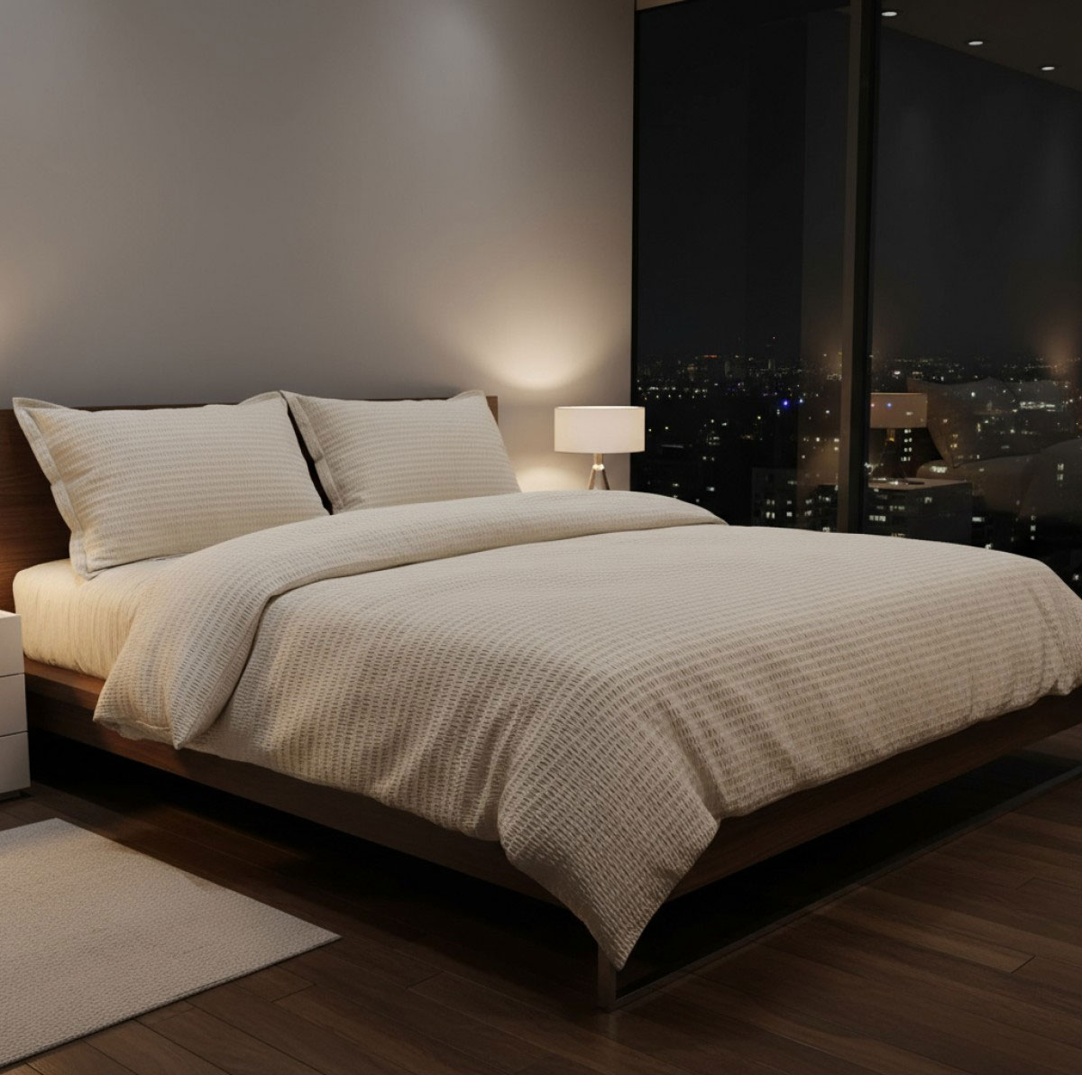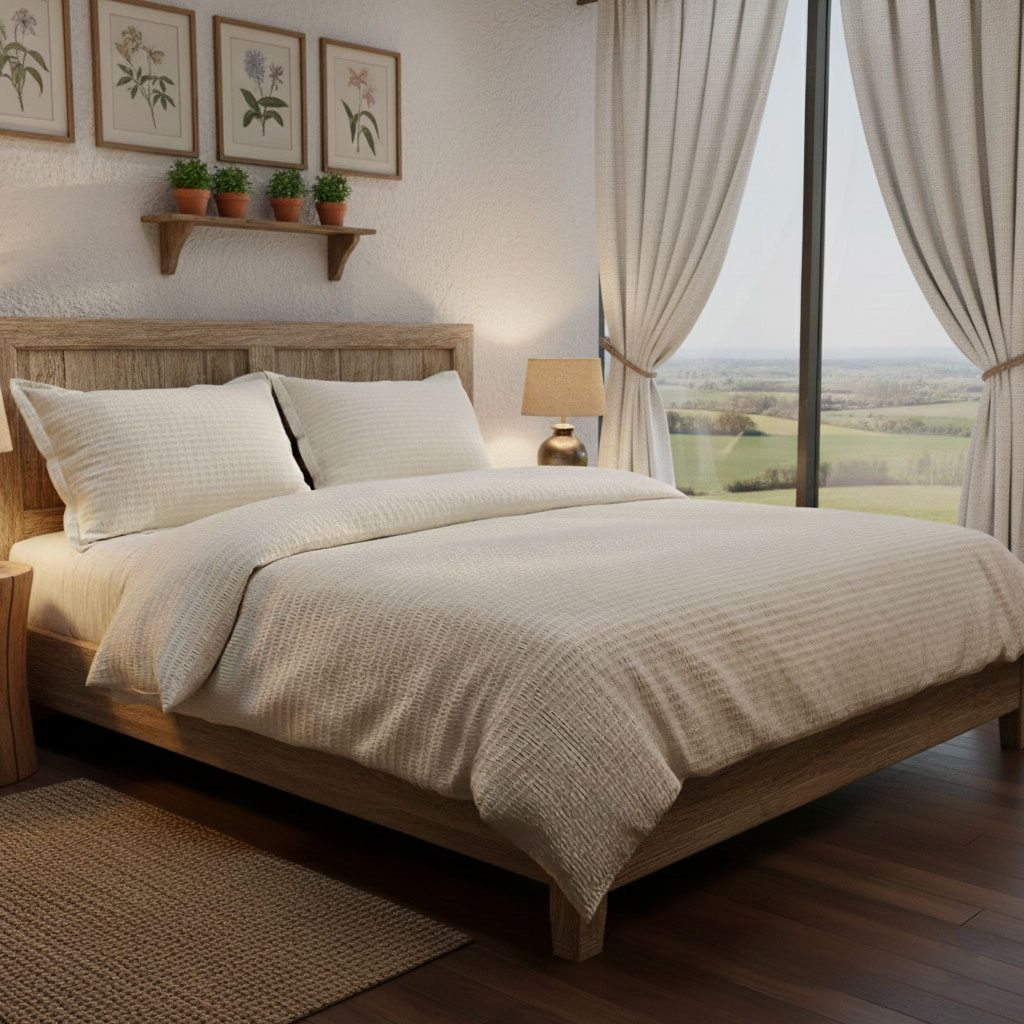 Изработен от 100% памучен крепон, комплектът впечатлява с характерната си релефна повърхност. Крепонът е дишащ и мек, осигурява комфорт при допир и отлична циркулация на въздуха – особено подходящ за всички сезони. Тъканта не се глади, което го прави практичен избор за динамично ежедневие, хотели и къщи за гости.