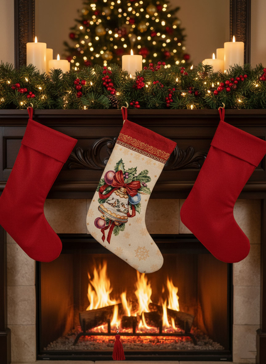 Този коледен чорап чудесно се комбинира с класически червени и златисти акценти – като жакардови калъфки за възглавнички, покривка с бродиран бордюр или празничен венец със свещи.