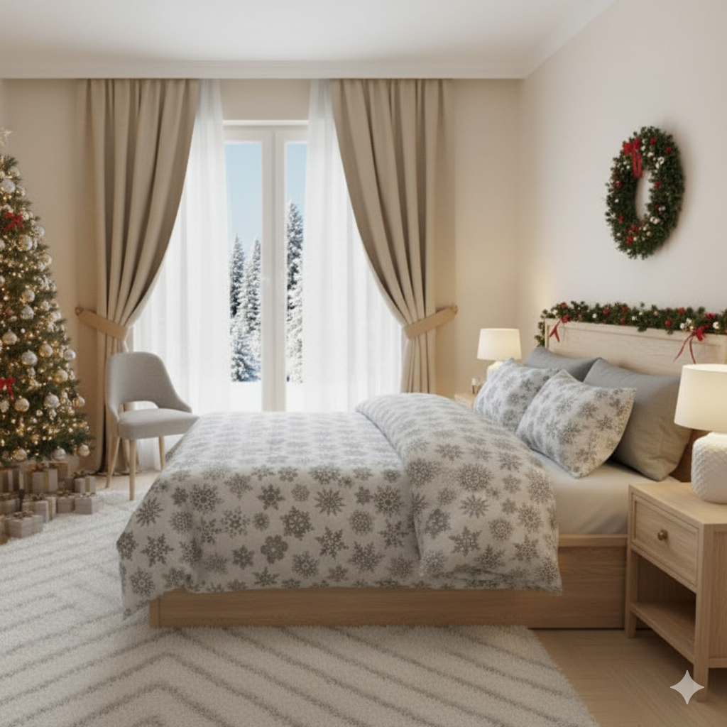 Коледа идва. Изберете този коледен спален комплект и зарадвайте своето семейство. Чудесни неутрални цветове и красиви снежинки с различна форма - - това е усещане за снежна чистота. Нежно и леко, сякаш празничните дни и Нова година леко пристъпват наоколо.
