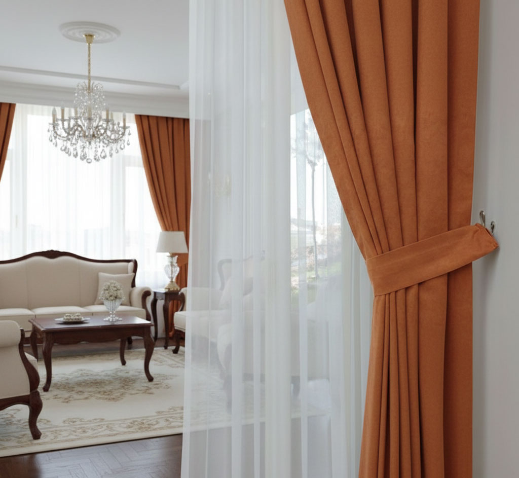 Хармония и стил в дома с готово за поставяне перде в топъл цвят теракота. Платът е плътен, мек и с деликатен матов завършек, който придава елегантност. Осигурява приятно затъмнение – подходящо за почивка или вечерен уют.