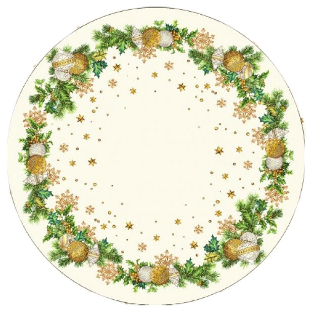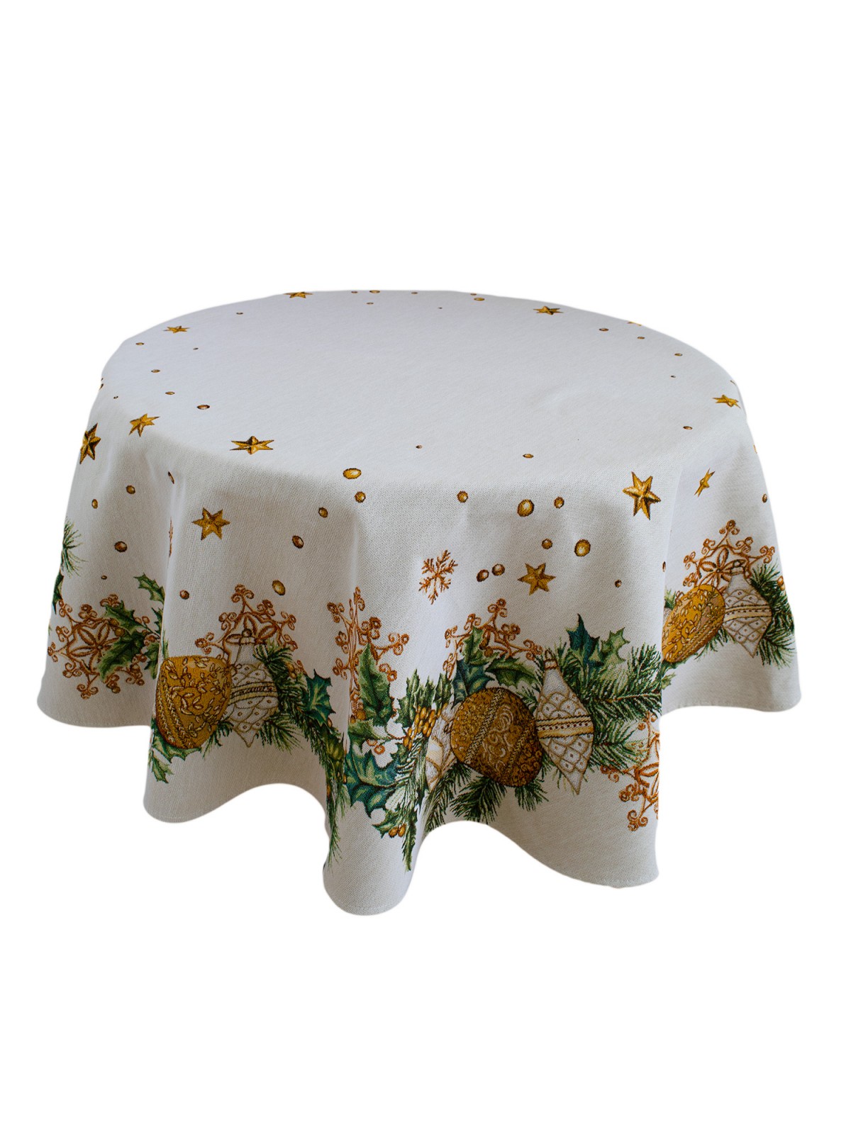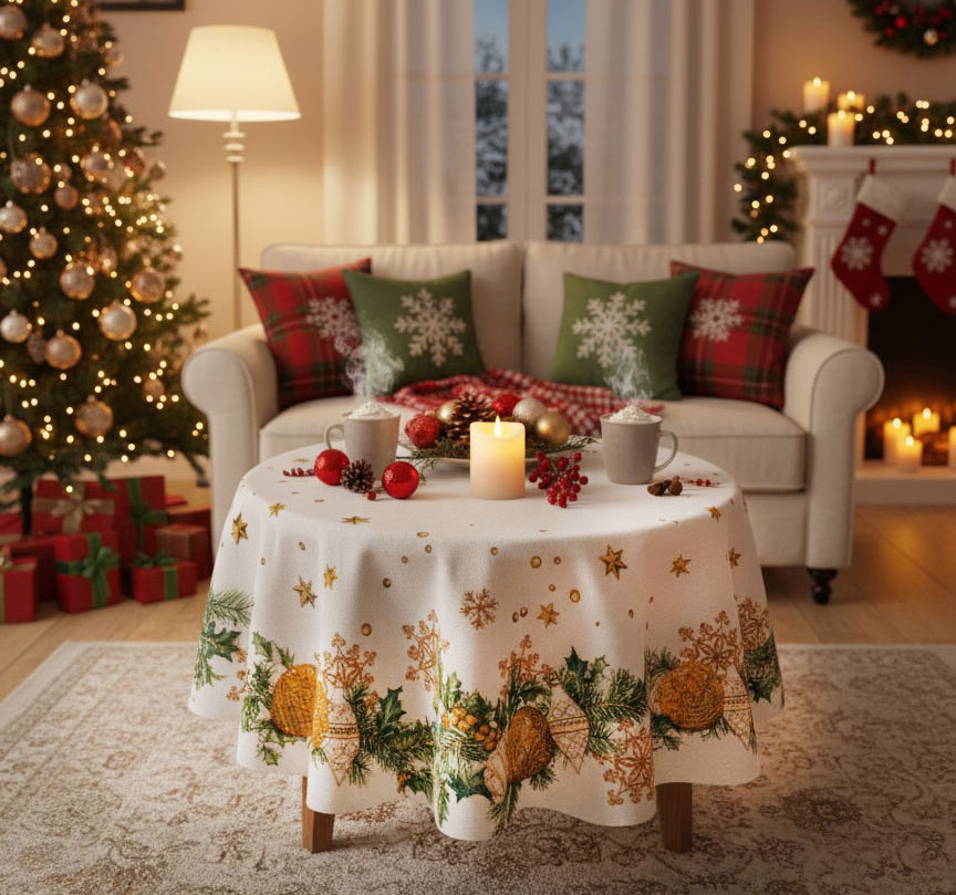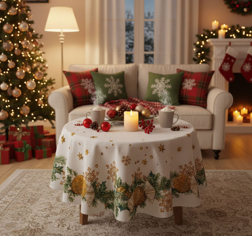 Създайте празнична атмосфера у дома с тази нежна коледна покривка за маса, изработена от жакард – комбинация от памук и полиестер. Кръглата форма с диаметър 135 см я прави подходяща за малки и средни маси, дизайнът в златисто, бяло и зелено с деликатни звездички и украса от елхови клонки придава усещане за топлота и празничен уют.
