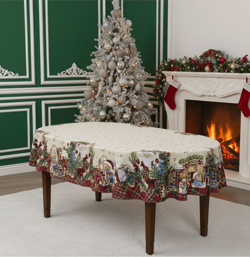 коледна покривка от жакард Весела зима се предлага в два размера - 140х180 елипса и Ф160 -кргла. Изработена от висококачествен жакардов плат с втъкани златни нишки, тя комбинира практичност, стил и празничен дух в едно. Покривката е с размери 140х180 см елипса и Ф160.