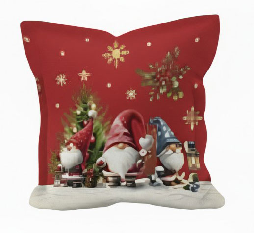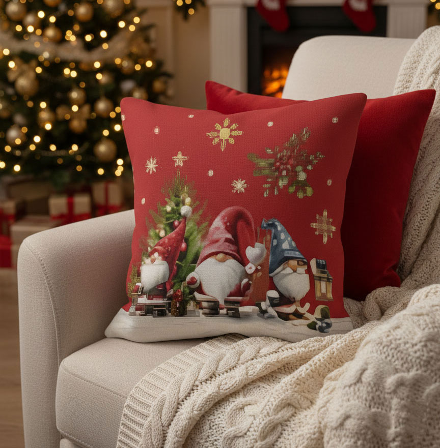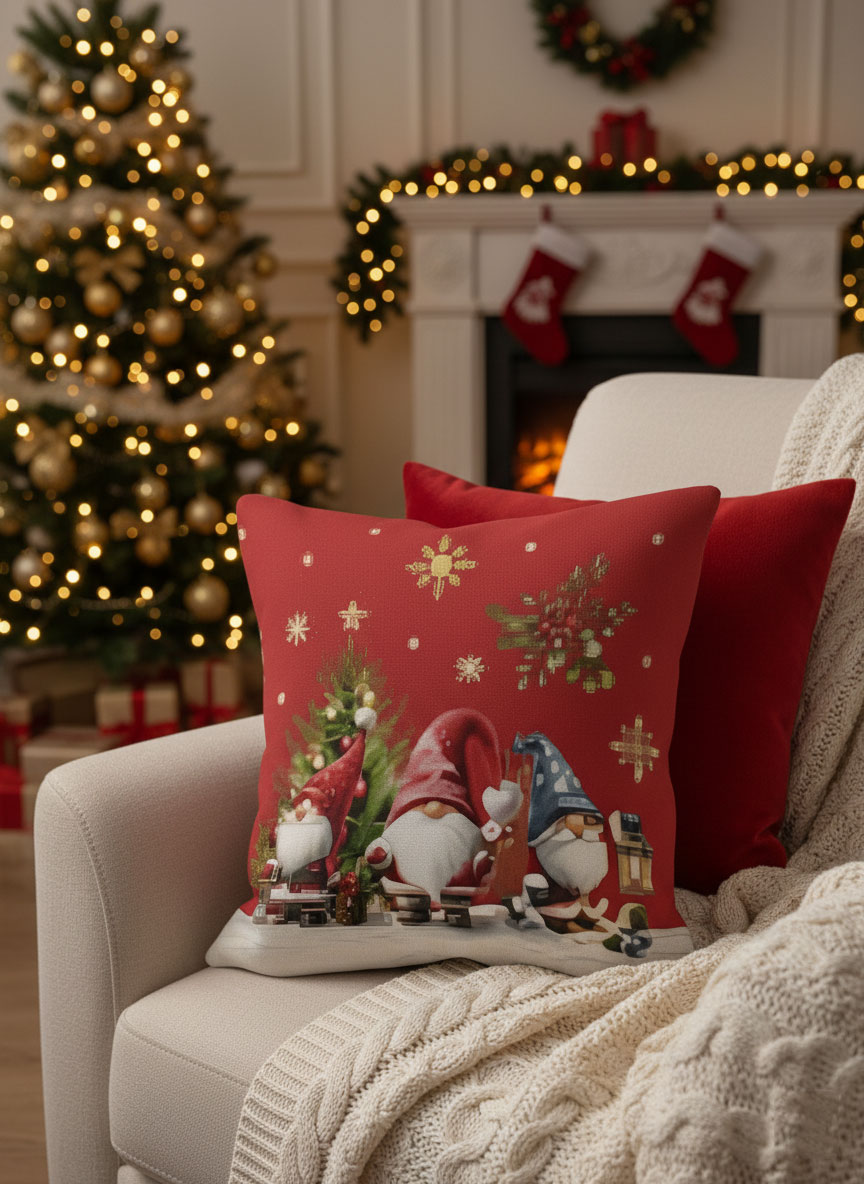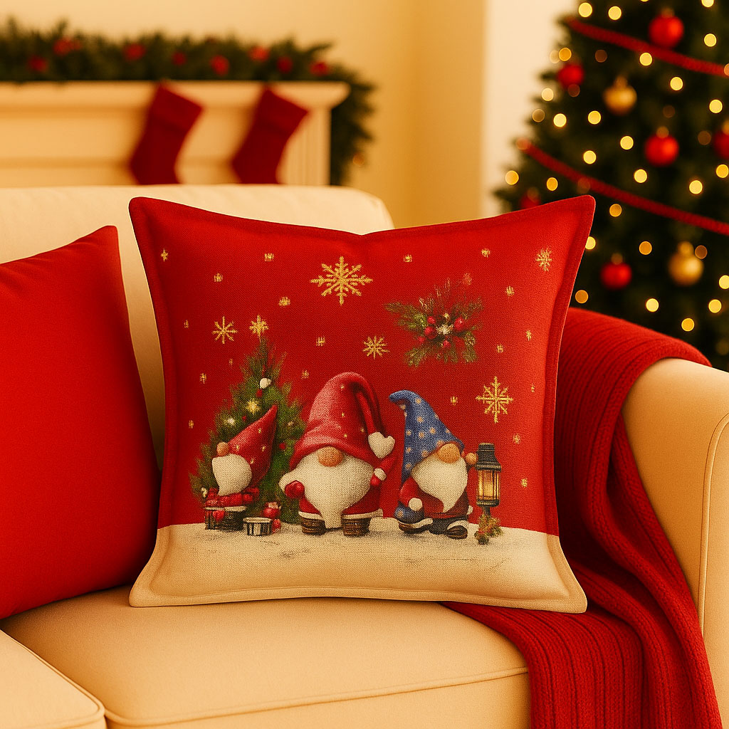 Дизайнът на коледната калъфка е вдъхновен от класическите зимни приказки - три малки джуджета с огромни ярки шапки, се събират край елха, украсена с лампички и снежни звезди. Фонът в топло червено излъчва радост и празничност. Детайлите в златисто и зелено носят усещане за уют и светлина. Калъфката е с размери 40х40 см и се затваря с цип в долната страна - практично решение, което осигурява лесна поддръжка.