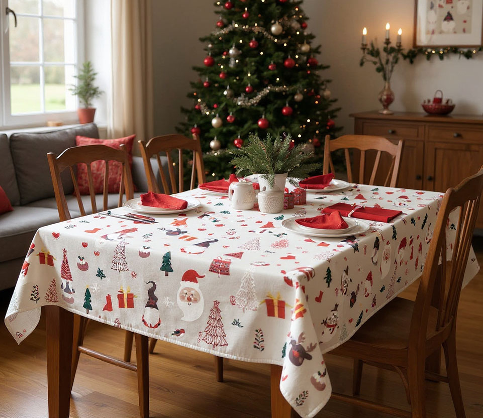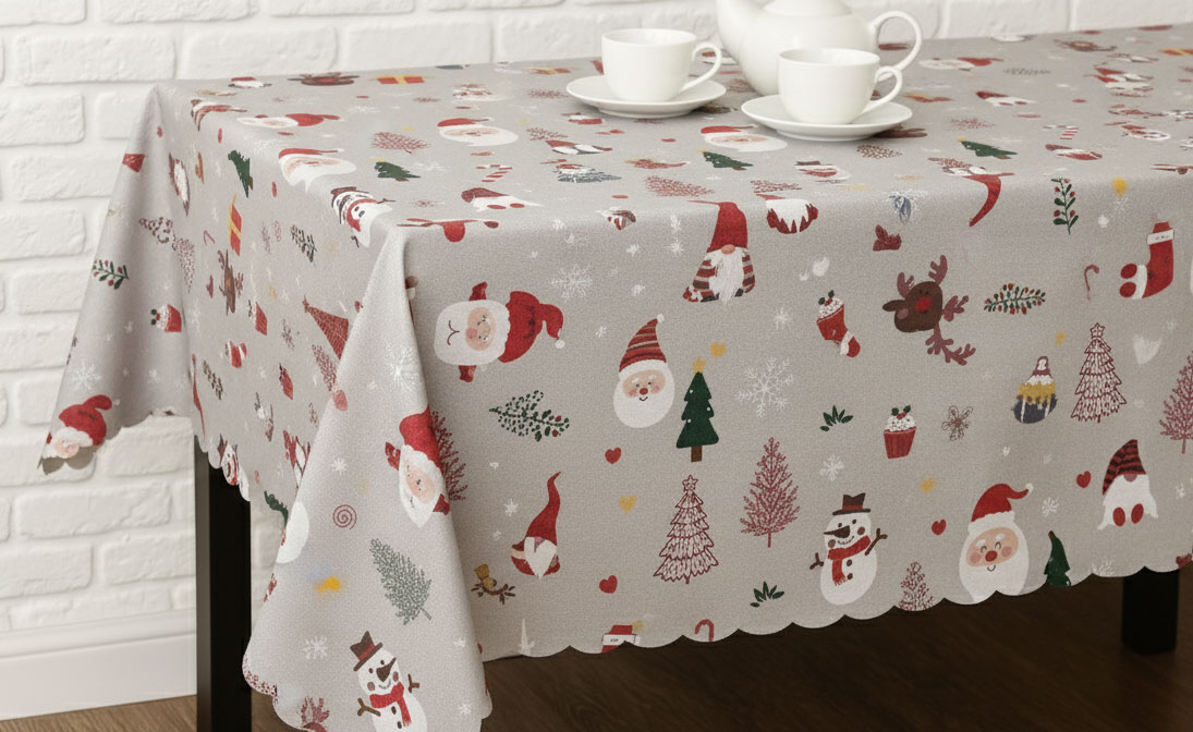 Покривката „Весела Коледа“ превръща обикновената трапеза в празнична сцена, изпълнена с настроение, уют и топлина. Вдъхновена от класическите коледни мотиви, тя представя весели илюстрации – снежковци, елхи, Дядо Коледа, елени и подаръци, съчетани с деликатни снежинки. Цветовата гама е хармонична и жизнерадостна – комбинация от червено, зелено, бяло и златисто, която създава усещане за радост и топлина в дома.