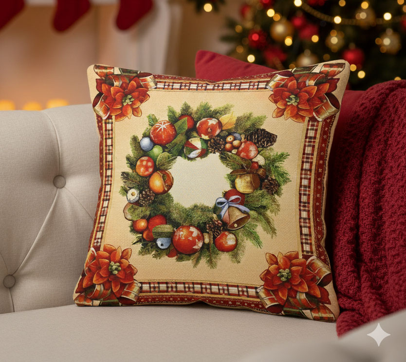 Коледната калъфка „Венец от уют и светлина“ е създадена за хора с вкус към детайла и желание да внесат топлина в празничния си интериор. Изработена от жакард с висока плътност и фина текстура, тя съчетава класически мотиви с качествена изработка, осигуряваща дълготрайност и изключително усещане за качество.