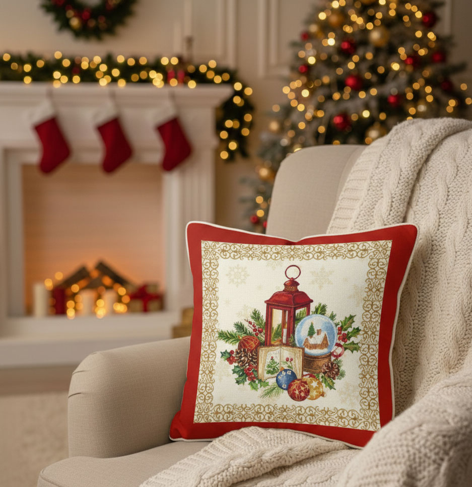 Коледната калъфка „Топла светлина“ е олицетворение на празничния уют - всяка нишка разказва история за обич, споделеност и светлина. Централният елемент – червен фенер с горяща свещ, е обграден от елхови клонки, шишарки, коледни топки и снежно кълбо със зимен пейзаж. Тази композиция символизира светлината в дома и надеждата през зимните празници.