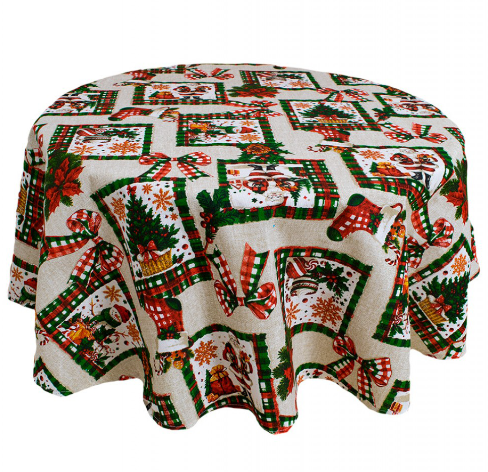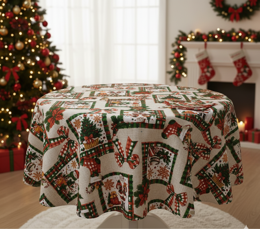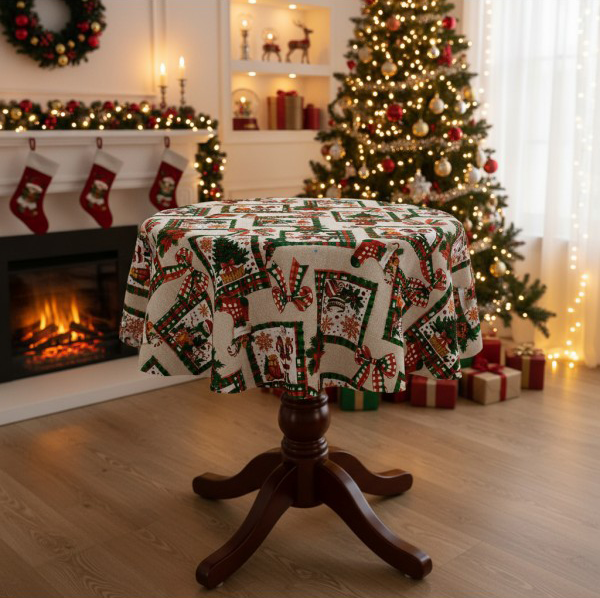 Десенът е богат на символика – коледни елхи, подаръци, камбанки и панделки, подредени в хармонични квадратни рамки с винтидж усещане. Цветовата палитра – топли червени, зелени и златисти нюанси върху неутрален фон – създава уют и подчертава празничното настроение. Покривката е универсална – стои прекрасно в класически, скандинавски или модерен интериор, като допълва всяка обстановка с дискретен блясък и коледна емоция.