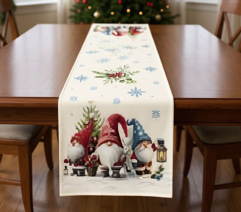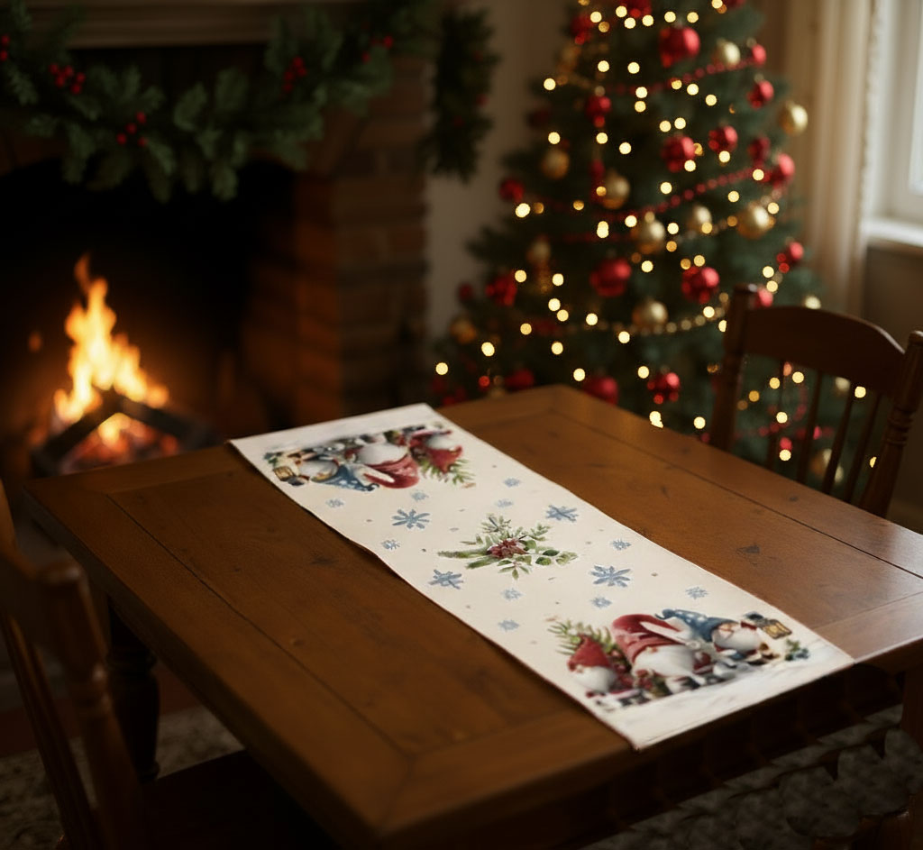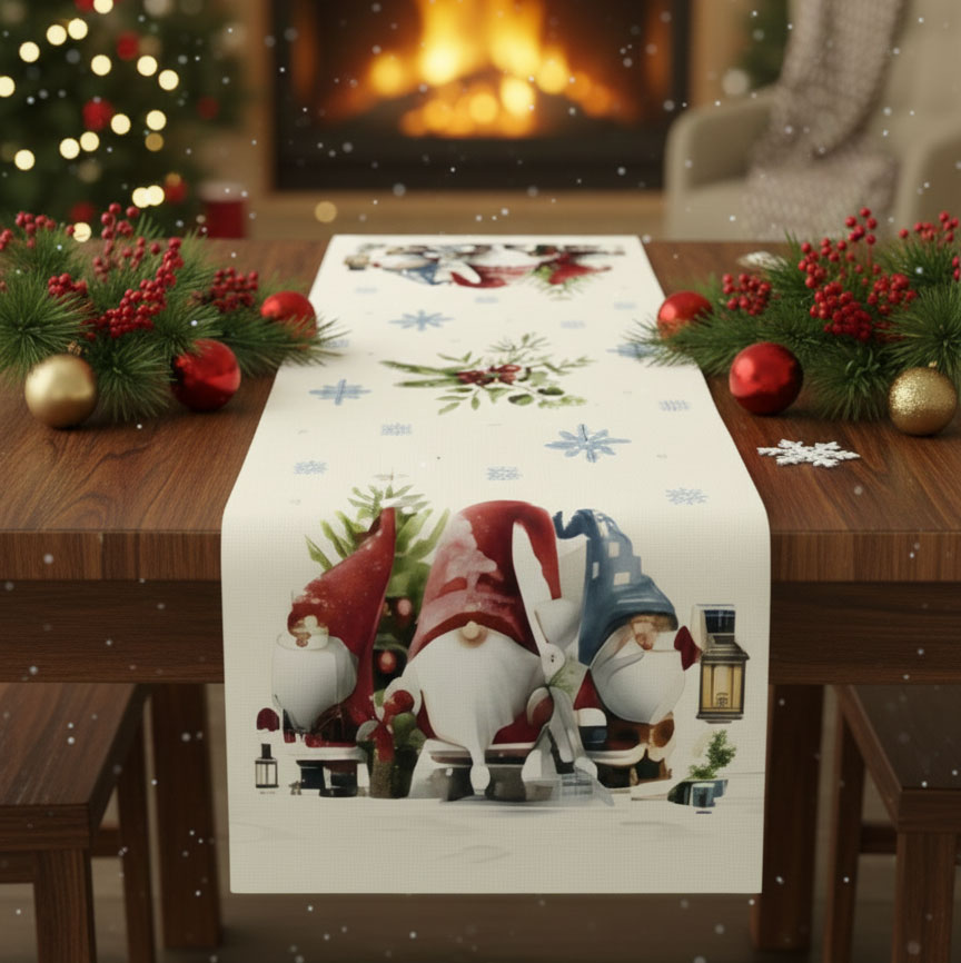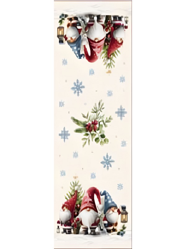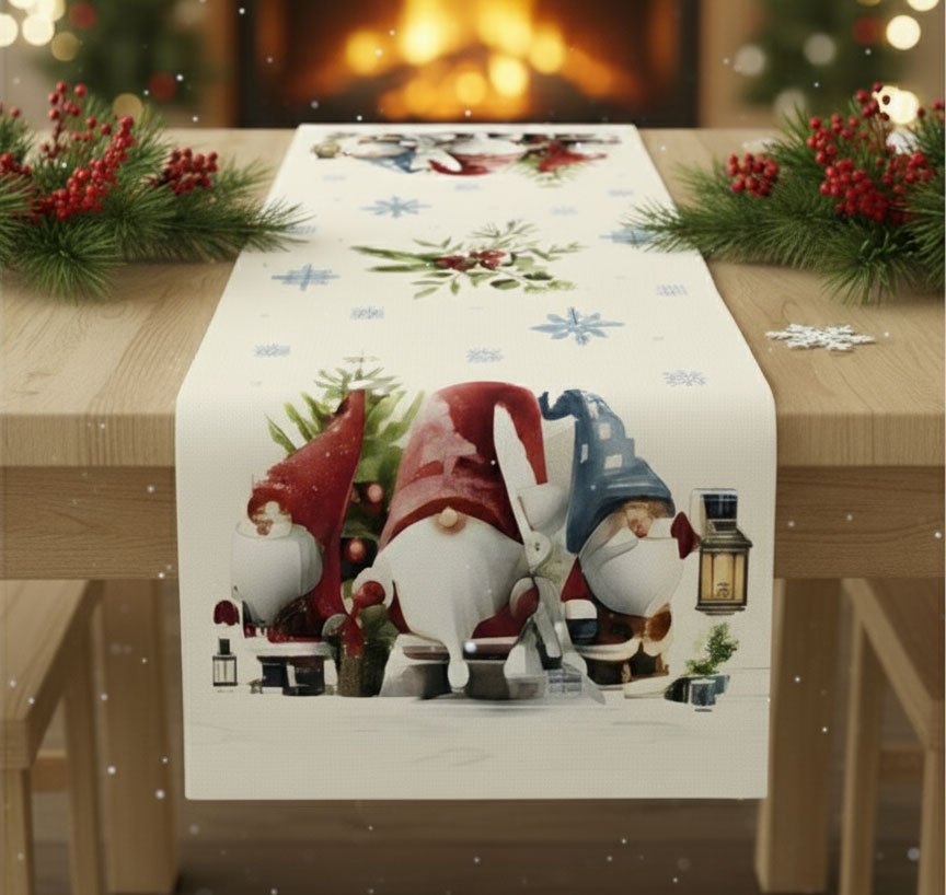 Дизайнът е с артистично изобразени гномчета с коледни шапки, фенери, подаръци, елхички и снежинки - елементи, които създават история и носят настроение само с един поглед. Централната част е по-спокойна, което позволява тишлайферът да се използва както самостоятелно, така и в комбинация с украса - свещи, ваза, плодове или празнични фигурки.