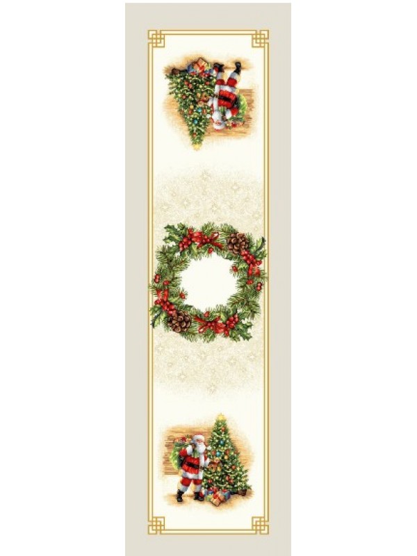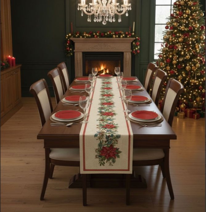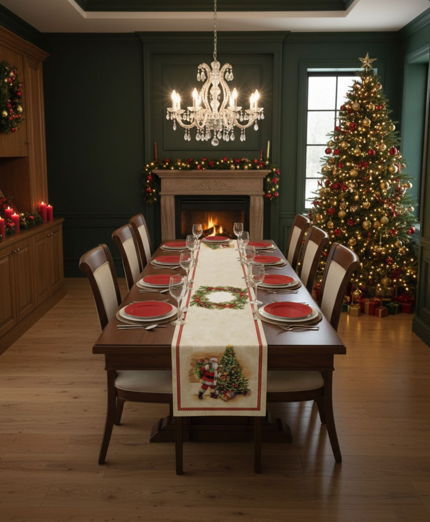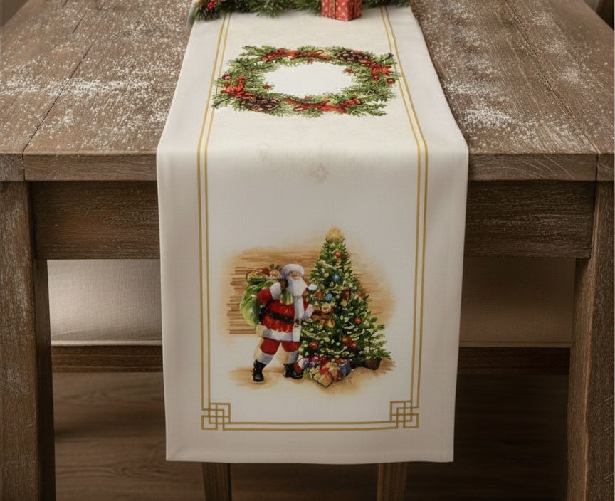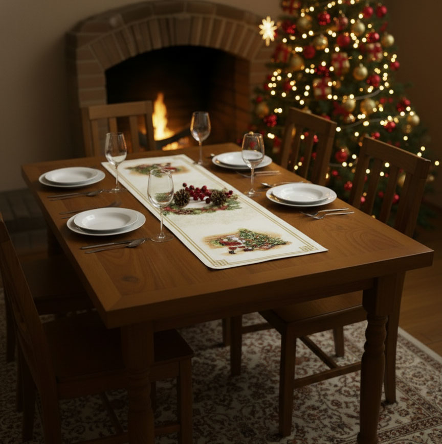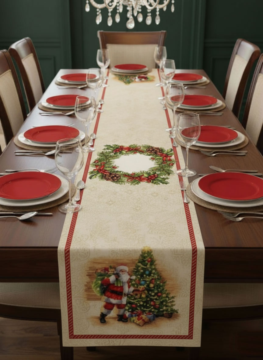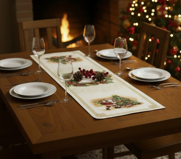 Дизайнът е внимателно създаден – нежен фон в екрю, върху който са разположени елегантни снежинки, коледни орнаменти, венци и фигури на Дядо Коледа, без да се нарушава усещането за изисканост. Това е тишлайфер, който не доминира над интериора - обогатява го. Подходящ е за трапезна маса, холна маса, конзола или кухненски остров.