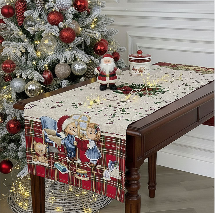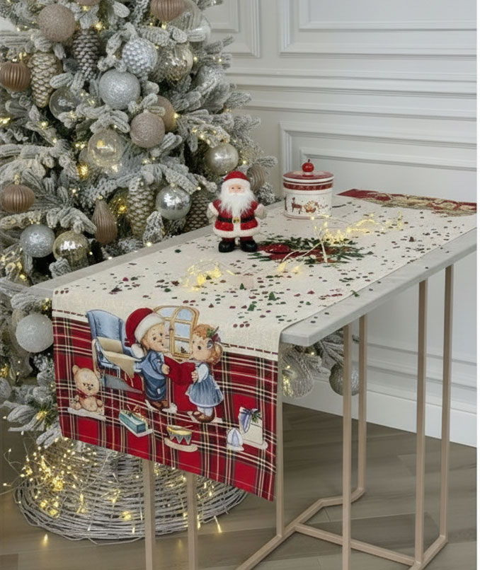Изработен от жакардов плат с много високо качество, който съчетава елегантност и устойчивост, този тишлайфер е декоративен елемент и малка празнична приказка. Детайлите са прецизно изпълнени: усмихнатите деца, играещи с подаръци; прозорецът, зад който летят снежинки; класическото червено каре, което създава традиционна коледна основа.