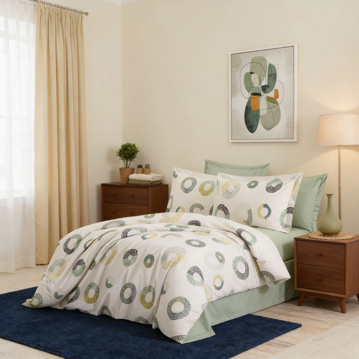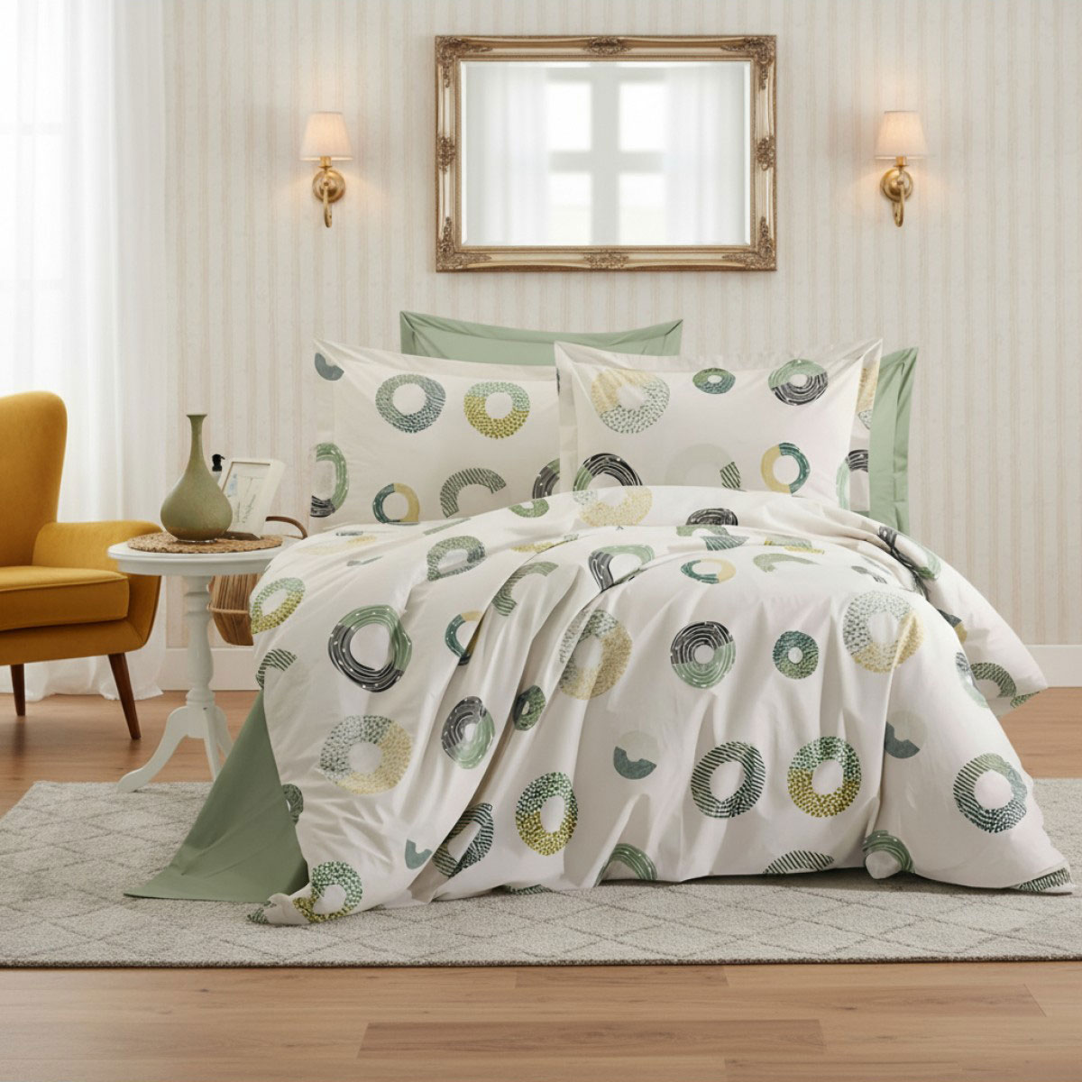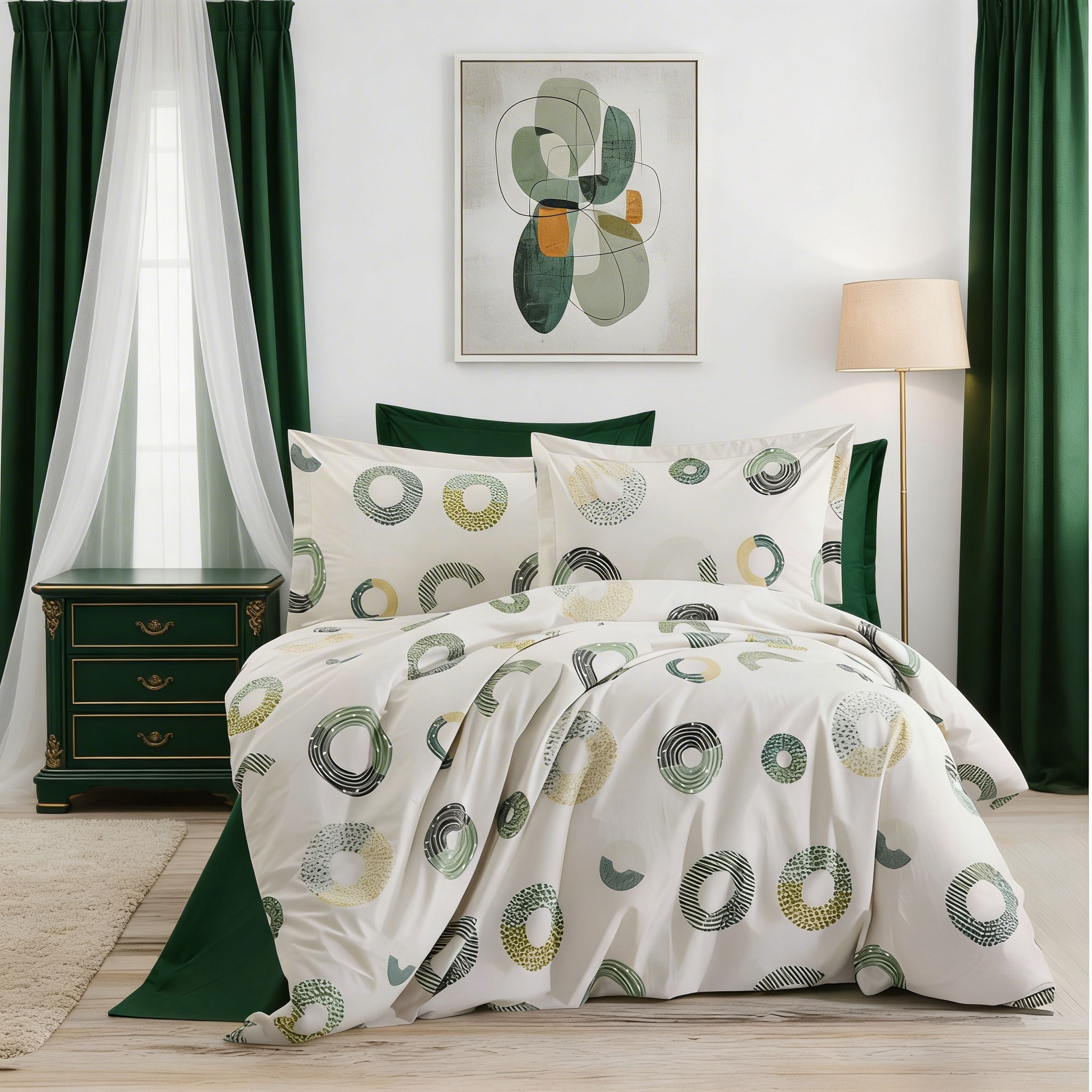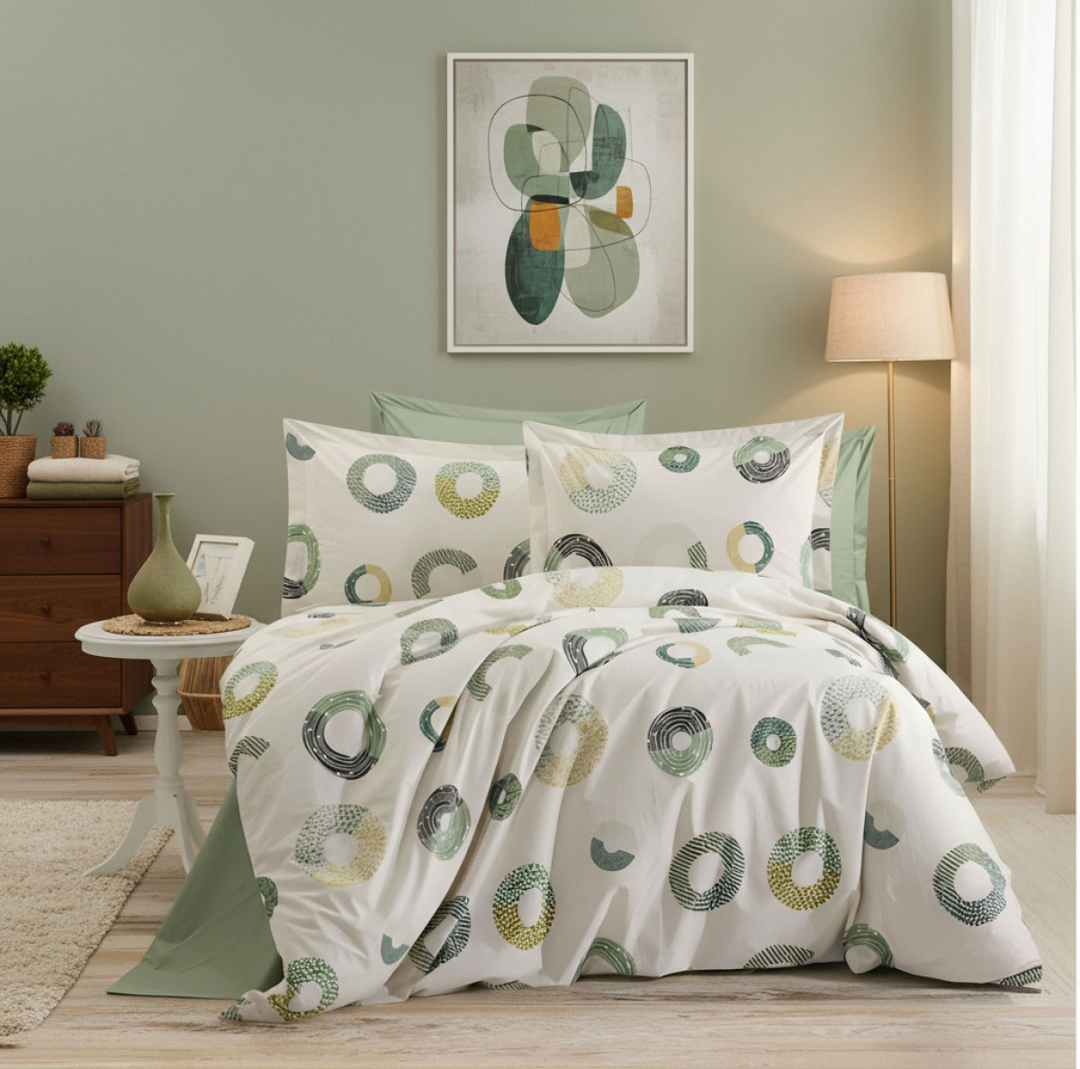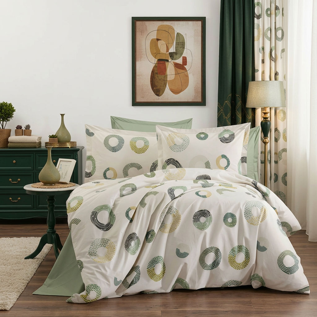 Спалният комплект Геометрия в зелено носи усещане за лекота и естествен баланс. Дизайнът на плата е с кръгове с различни текстури и нюанси на зелено, маслено, мента, сиво и бледо жълто, комбинирани върху светъл фон. Тази композиция създава визуален ритъм, който едновременно успокоява и оживява интериора. Комплектът е отлично решение за хора, които ценят изискваната геометрия, чистите форми и естествените цветове.