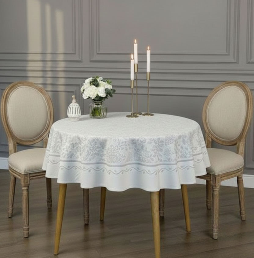 Размер Ф135 е перфектен за кръгли маси в класически или модерни интериори - от дневни и трапезарии до уютни кухни. Покривката се съчетава чудесно с декорации в бяло, крем, златно или пастел, с керамични вази, свещници или цветни аранжировки. Тя е идеална и за веранда или градински кът, където естествената светлина подчертава деликатния жакардов рисунък.