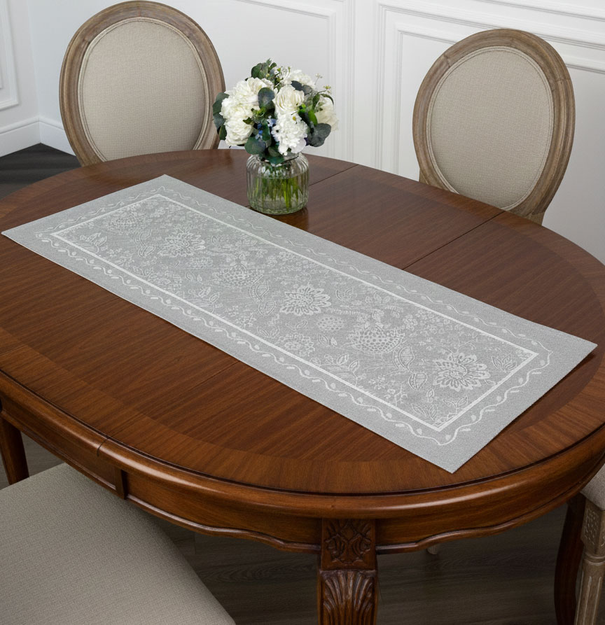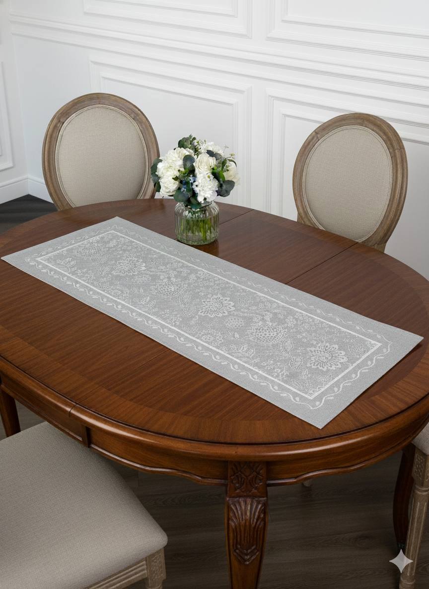 „Сребърна тишина“ е жакардов тишлайфер, създаден за пространства, в които естетиката е присъща. Фината жакардова тъкан разкрива изящни флорални мотиви, вплетени с прецизност и усещане за ритъм. Орнаментите създават усещане за дълбочина и текстура, без да натоварват визията.