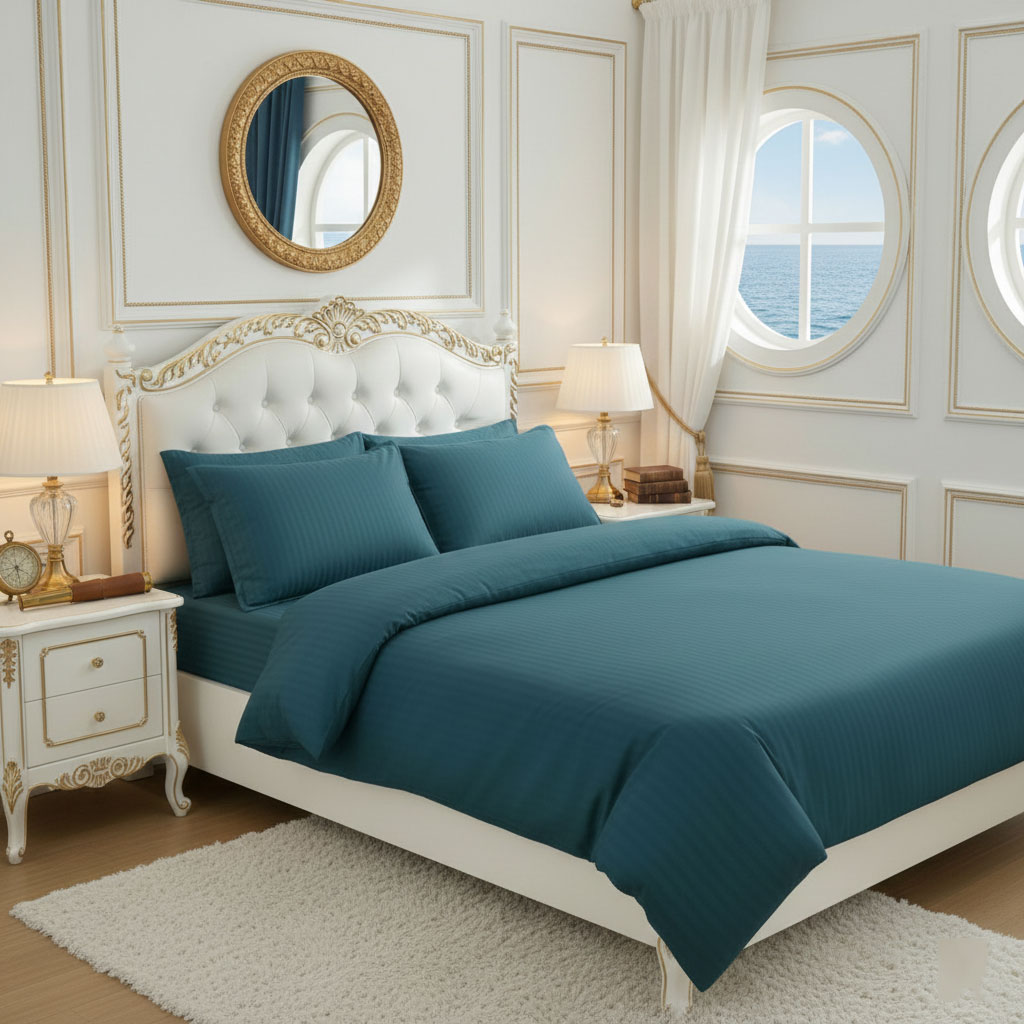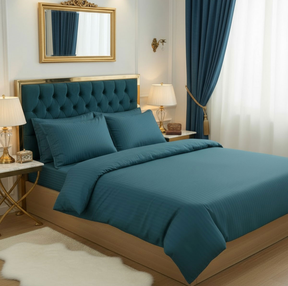 Изискан спален комплект от фин памучен сатен в петролносиньо - деликатно рае, подходящ за подарък. Едноцветен.