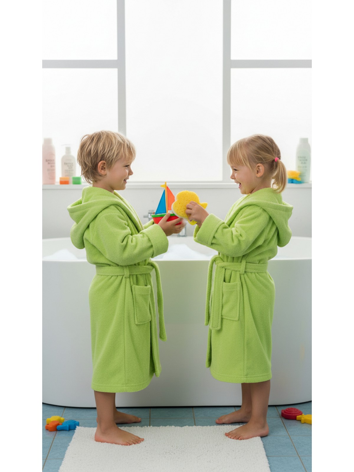 Пухкаво зелено детско халатче за момиченца и момченца. Предназначен за попиване на влагата от детското тяло след баня. Детско халатче, ушито от плътен хавлиен плат и розов плюш.