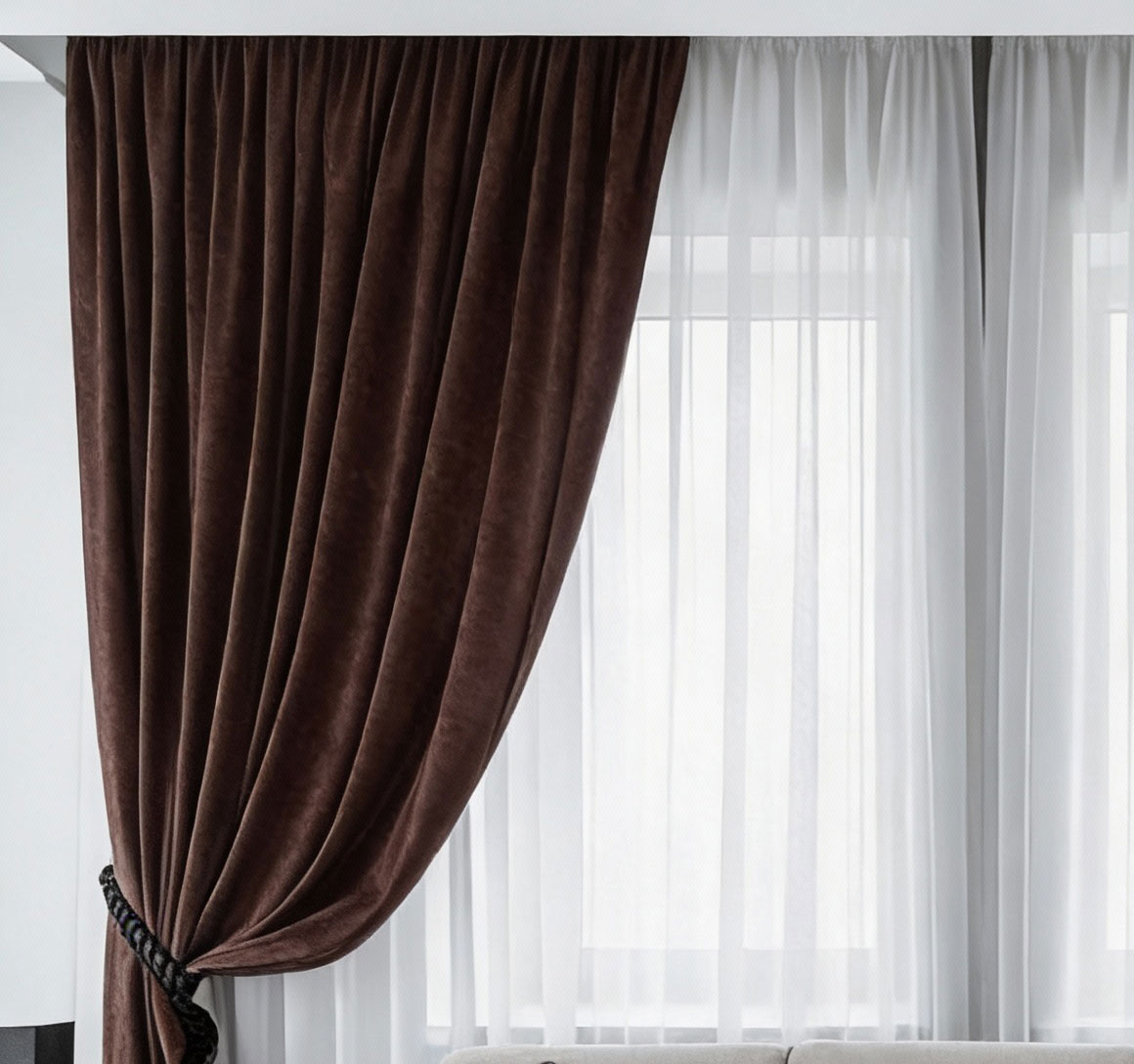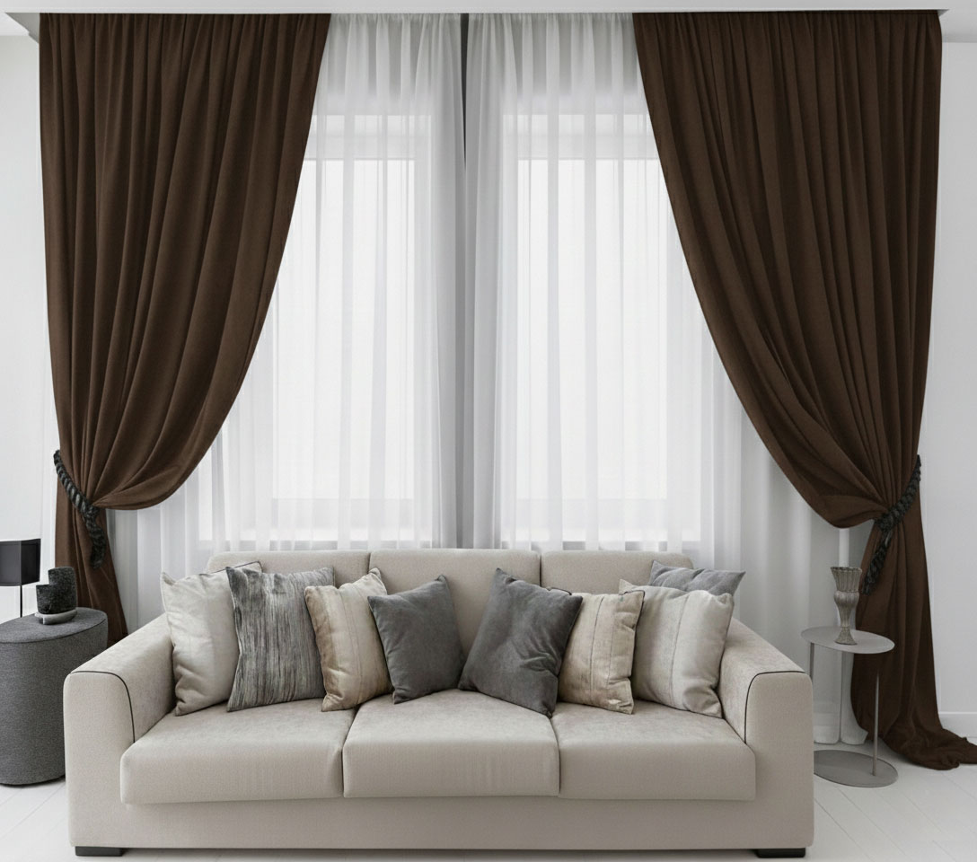 Тъмнокафявото обича светлите партньори. Ако комбинирате с бял воал, през деня ще имате лекота и светлина, а вечер – повече уединение и спокойствие. С воал в екрю или шампанско става още по-топло и уютно, особено ако в стаята има дървесни тонове. За завършен ансамбъл добавете килим в кремаво или пясъчно и възглавници в нюанси на екрю, сиво и карамел – или една-две по-смели като акцент, например маслено зелено. Така завесите не са просто фон, а тихият елемент, който „събира“ цветовете и прави всичко да изглежда премерено.