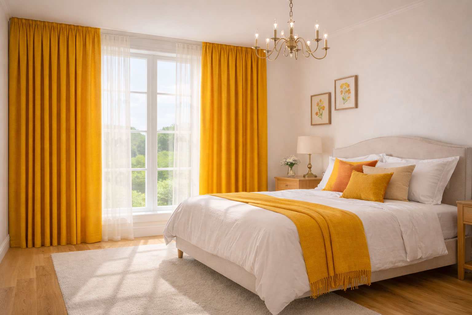 С декоративни възглавници или килим в близки жълти и оранжеви тонове за завършен вид.