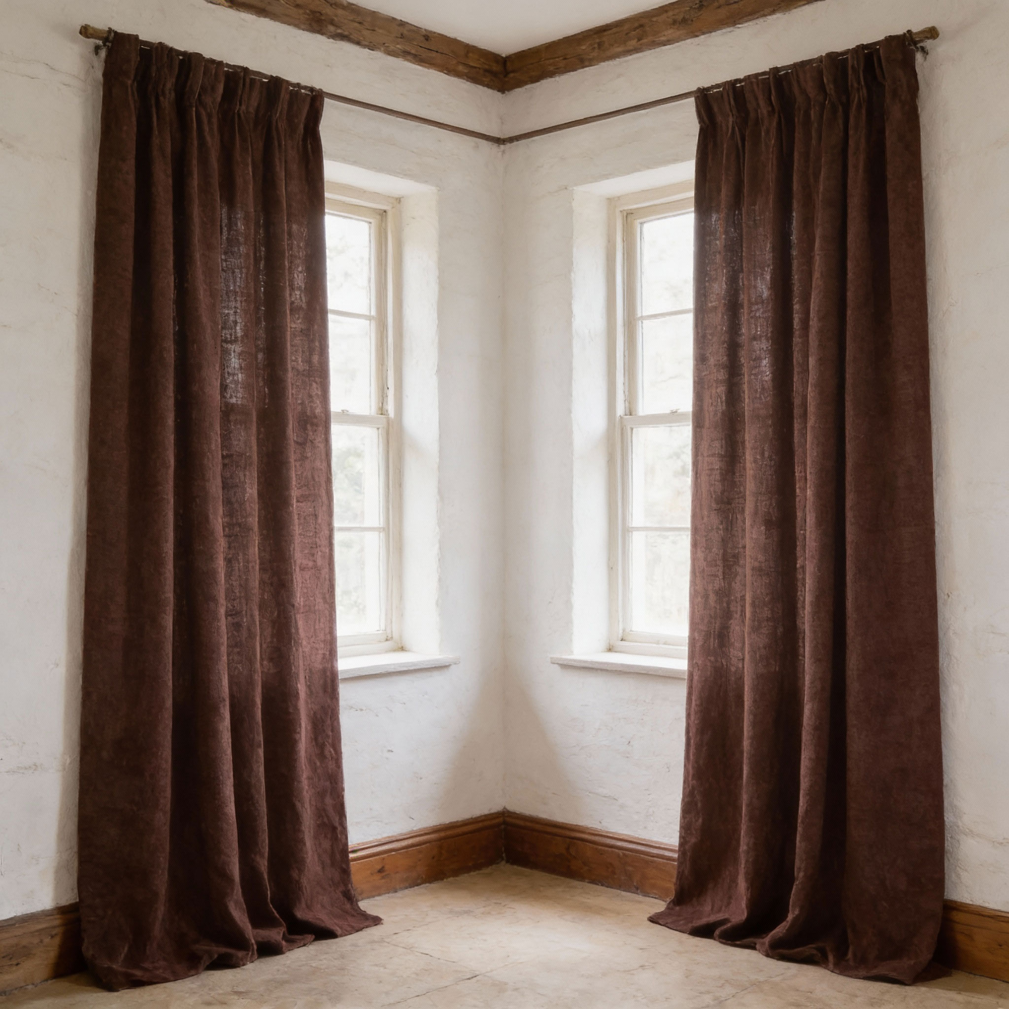 Готови за плътни пердета в кафяво-бежова гама. Цветове са наситени, нюансът е ясно различим. Плътните кафяви пердета се съчетават чудесно с тънки пердета от рисуван воал, или едноцветен бял/екрю.