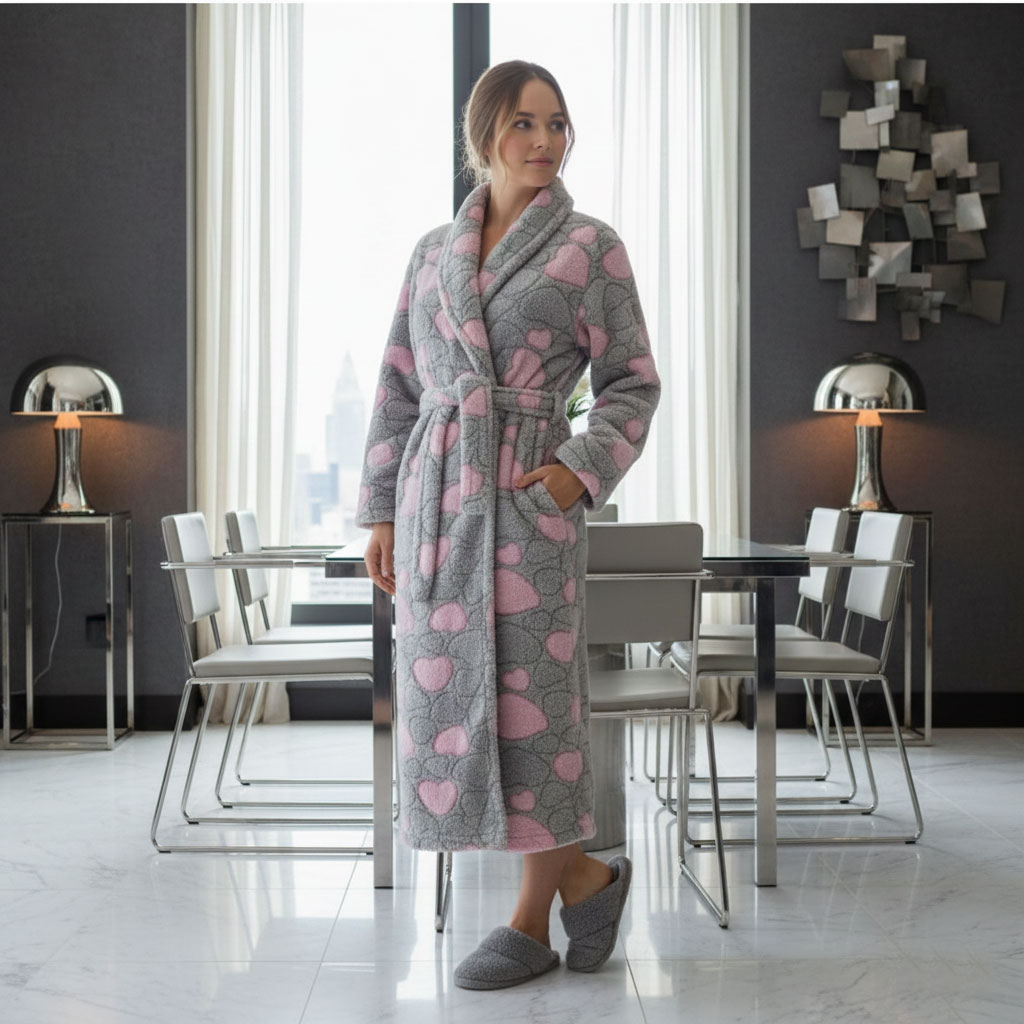 Халатът е с чудесен десен, който създава настроение. Вие се чувствате като звезда в романтична коледна история.