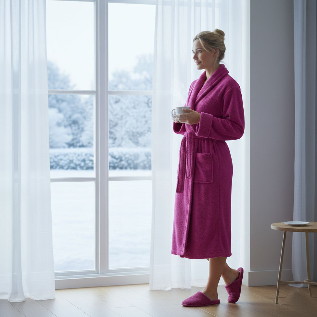 Домашен халат, подходящ за жени - топъл, пухкав и мек. Цветът е цикламен - симпатичен и елегантен. Великолепно се съчетава с домашна обстановка, решена в светли тонове. Материята е микрофибър, 100% полиестер. Много приятна на допир.