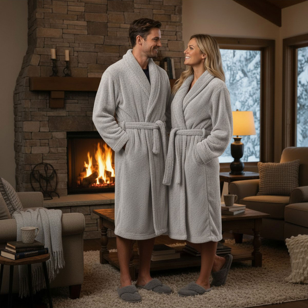 Домашен халат от светлосив плат. Подходящ е както за мъже, така и за жени. Много е топъл, пухкав и мек. Материята е микрофибър, 100% полиестер, приятна на допир.